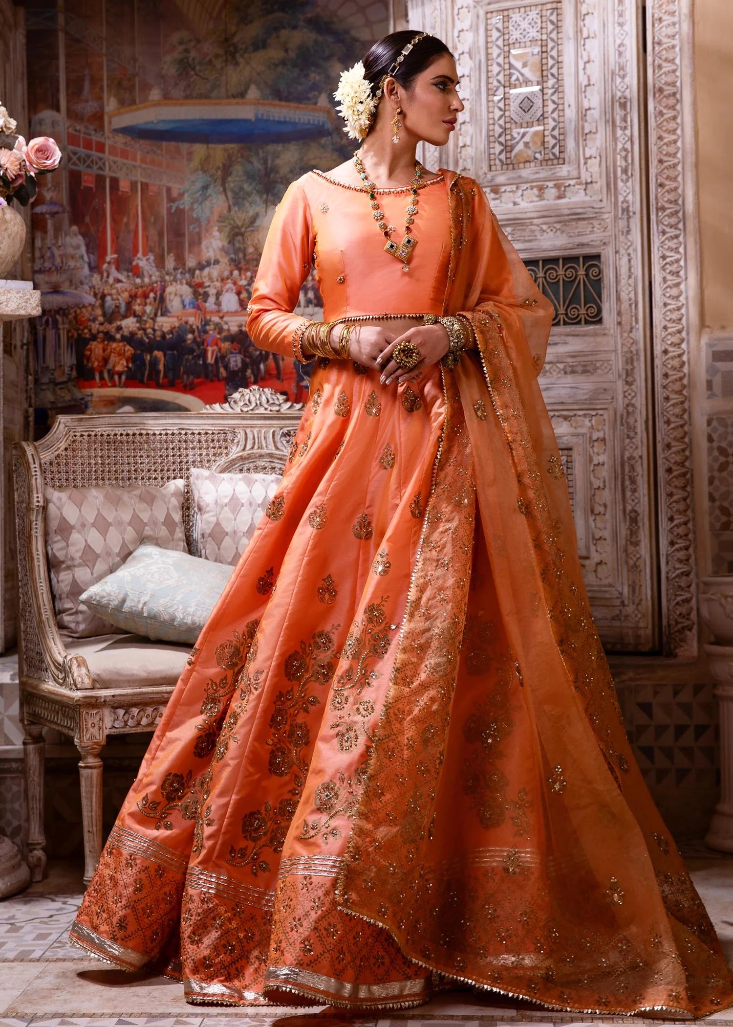 Description: Indian raw silk with hand-printed floral pattern and embellished with all handicrafts kora, dabka, nakshi, pearl, stones and more over decorated with traditional tassels. Paired with organza dupatta with four side border and Chan all over.