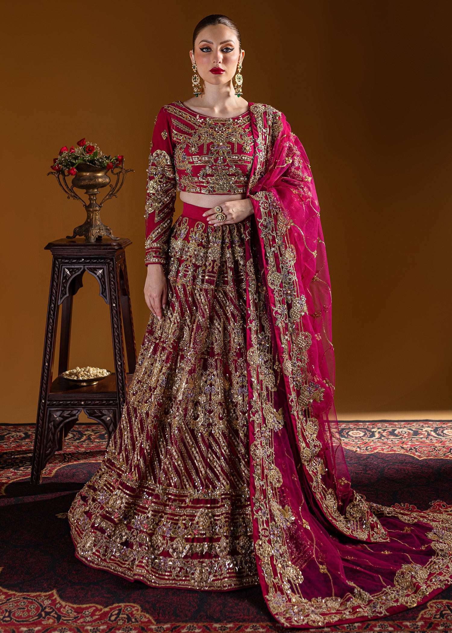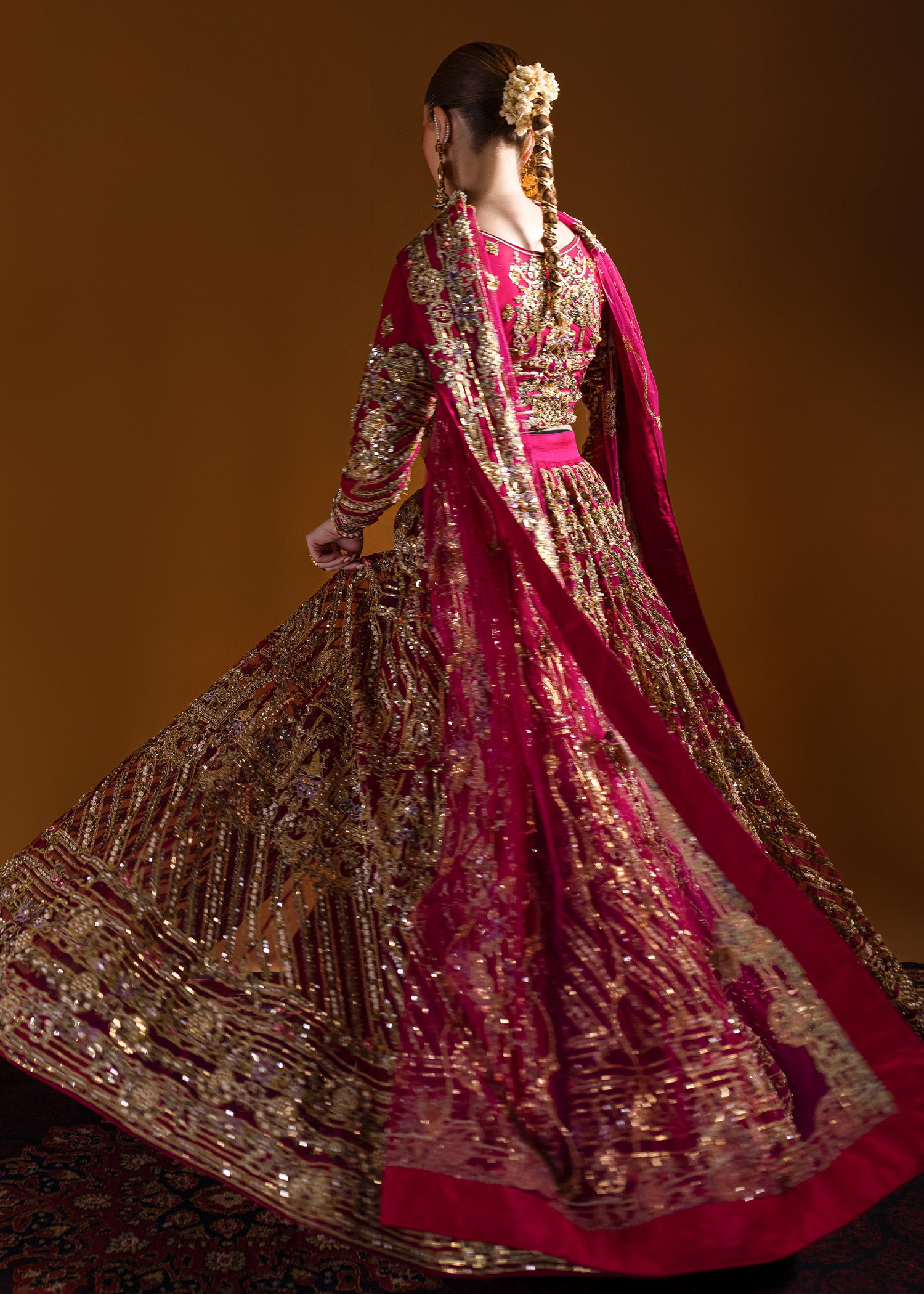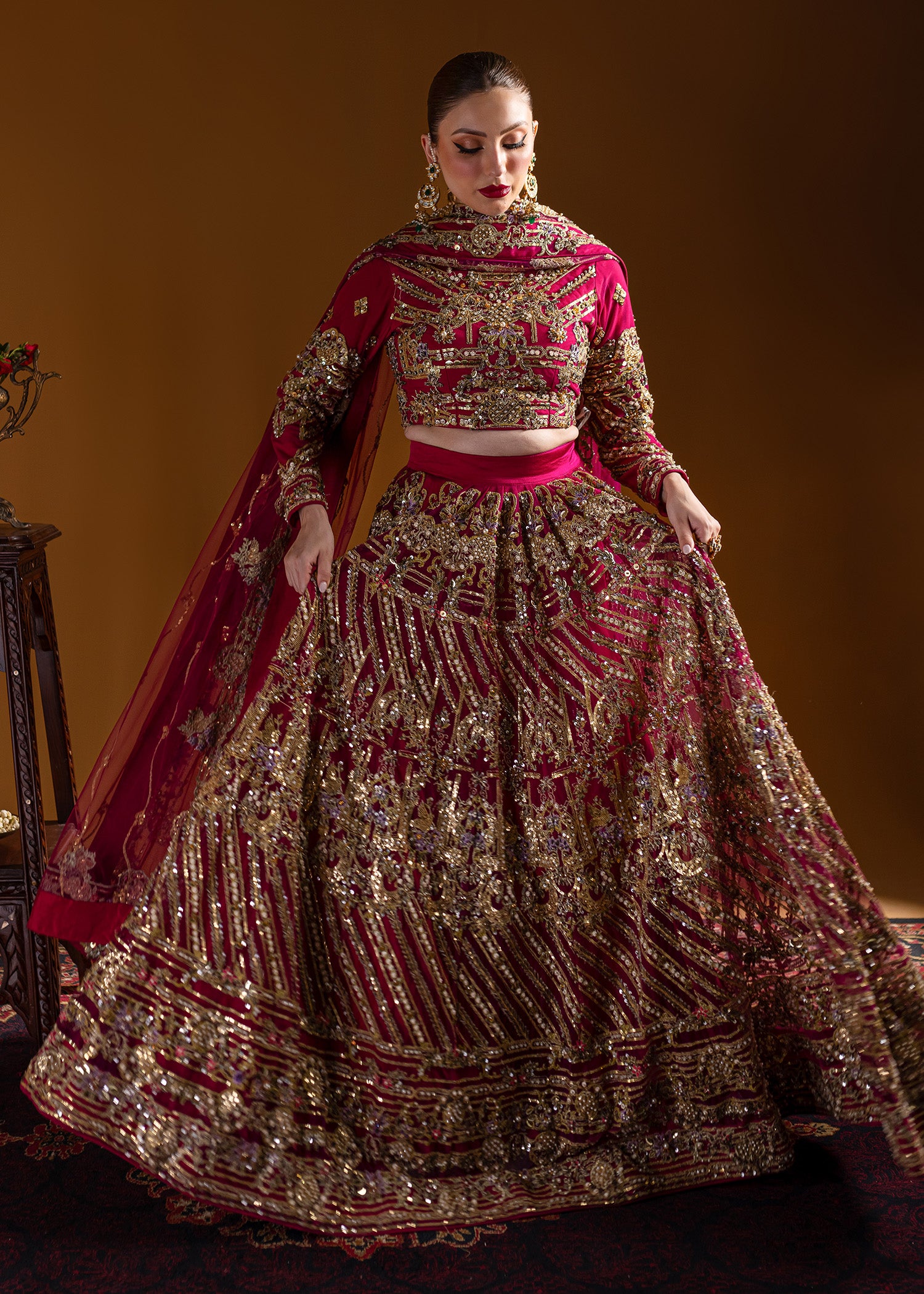 Traditional round-shaped lehenga choli with incredible gold wire jall, embellished with traditional dabka, naqshi, sequins, gems, and pearls. The traditional dupatta features a four-sided resham kacha tanka border with an all-over bunch and lines pattern, enhancing the look. All traditional techniques are executed on a modern palette, creating a contemporary masterpiece.