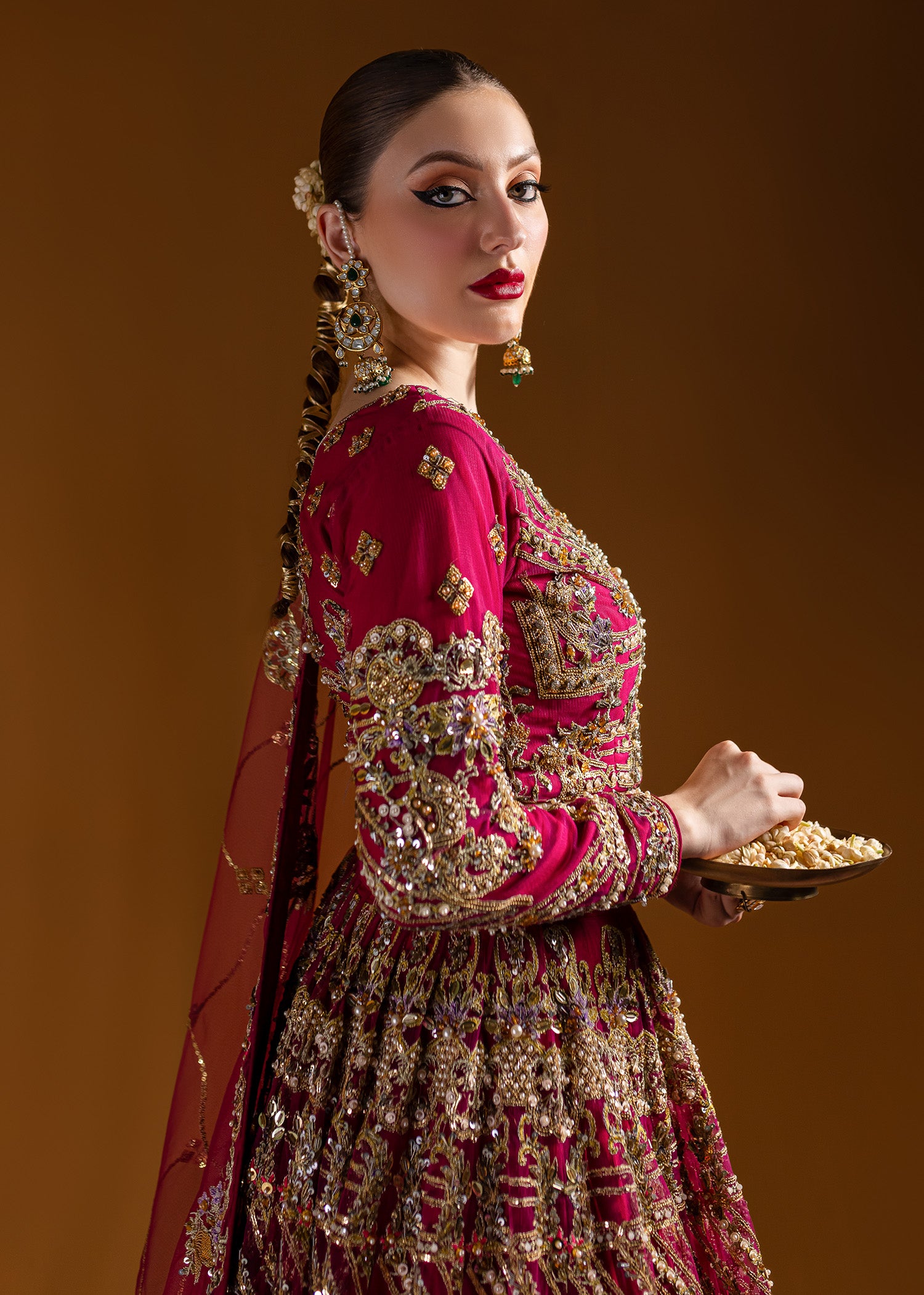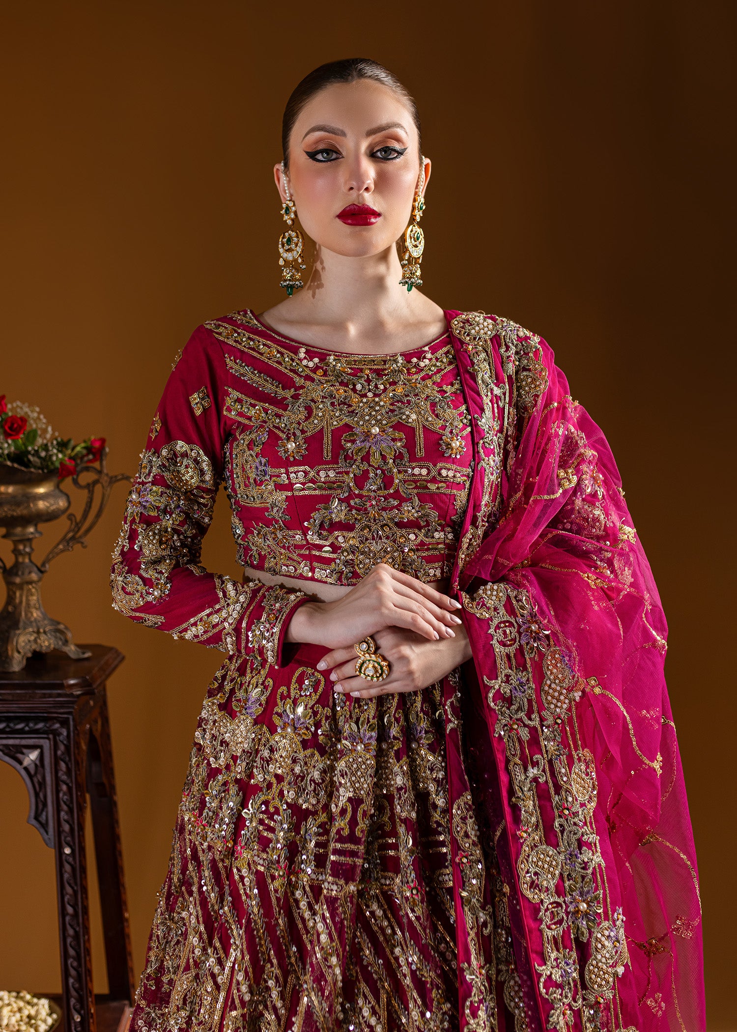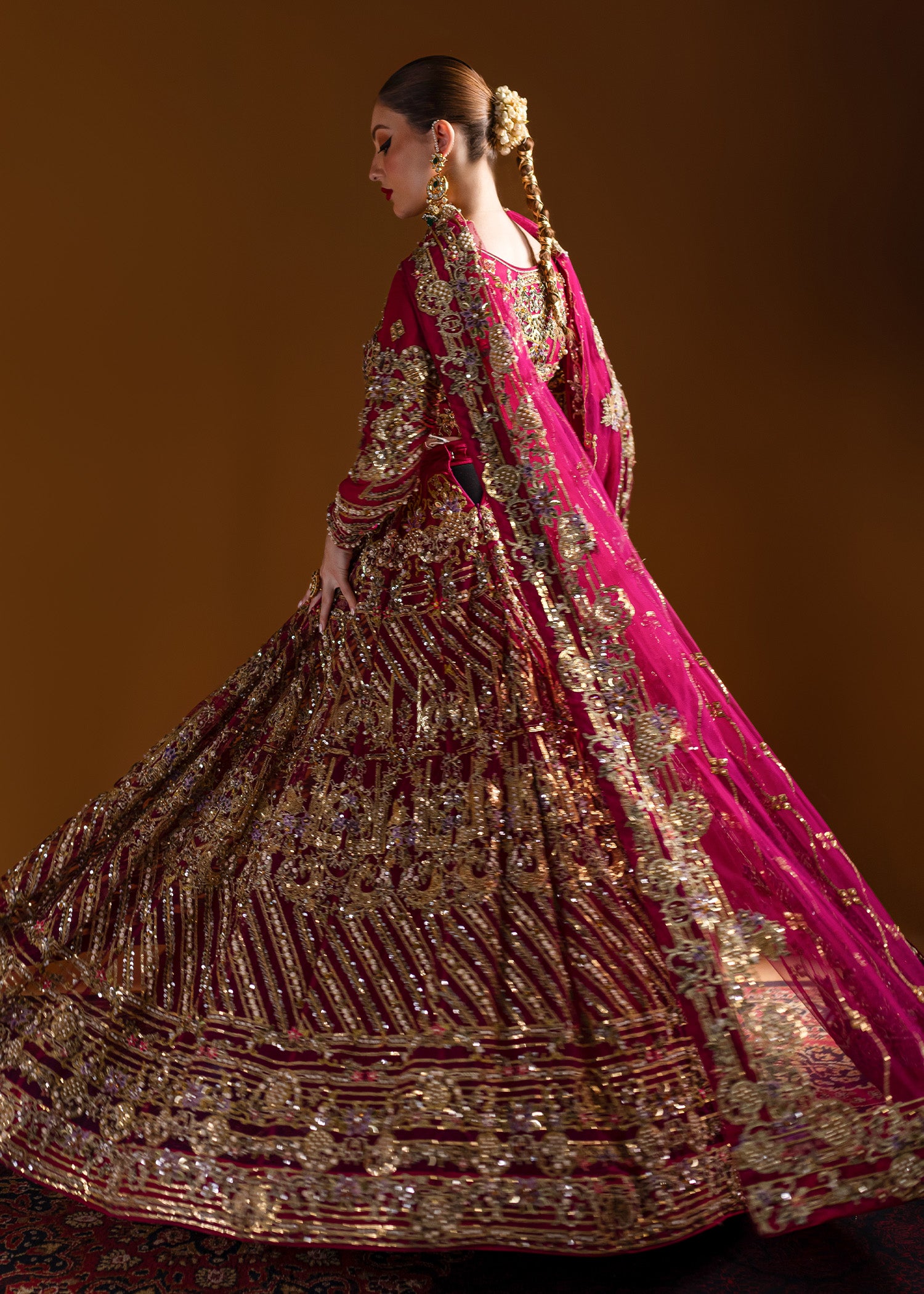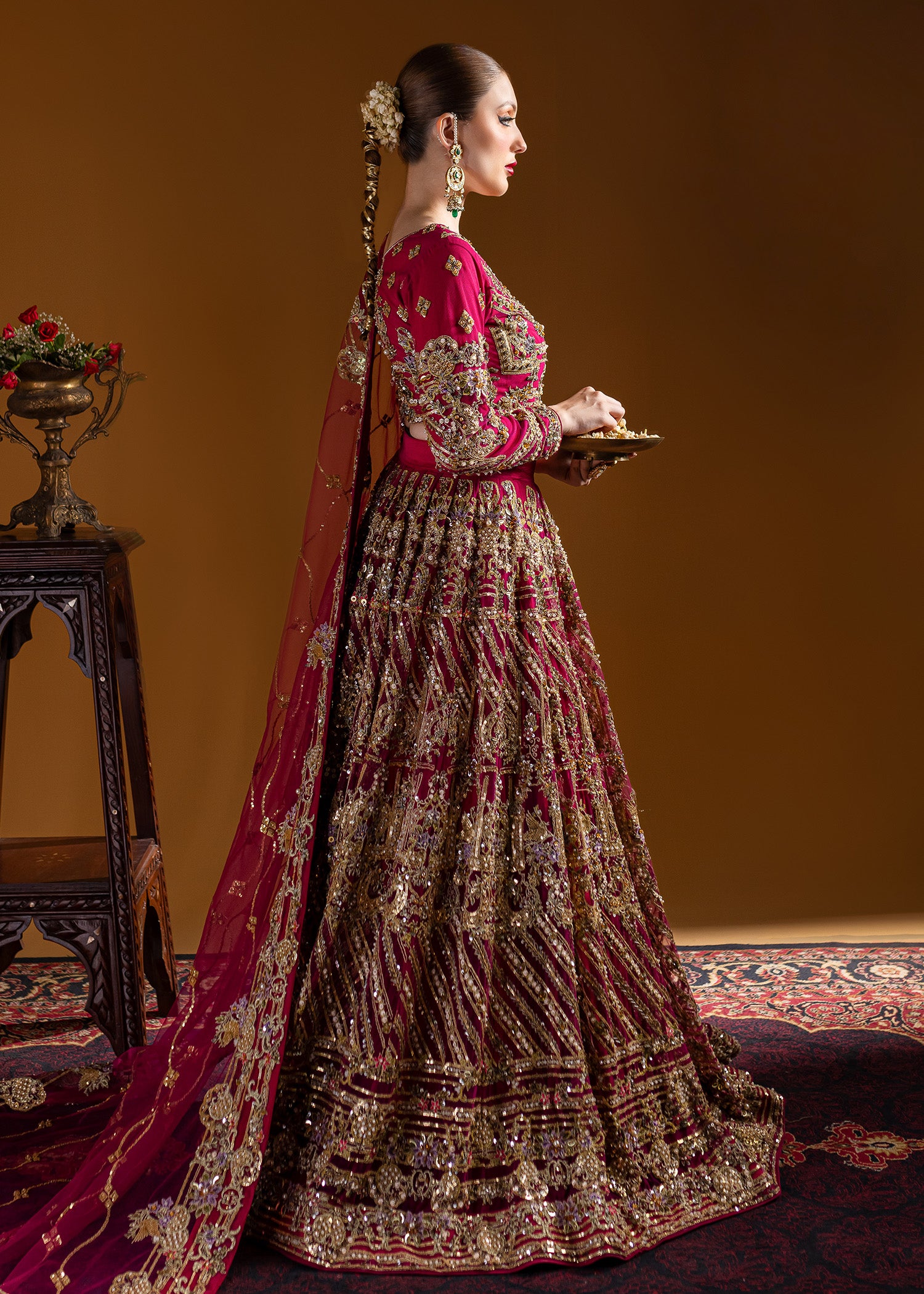 Traditional round-shaped lehenga choli with incredible gold wire jall, embellished with traditional dabka, naqshi, sequins, gems, and pearls. The traditional dupatta features a four-sided resham kacha tanka border with an all-over bunch and lines pattern, enhancing the look. All traditional techniques are executed on a modern palette, creating a contemporary masterpiece.