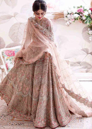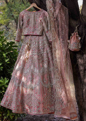 A lovely rose gold FAS bridal with flattering details. It includes luxury embezzled with uber extravaganza embroideries. Honeycomb mesh pattern dupatta and a beautiful pouch add oomph to the look. A blend of traditional crafts, dripping in couture and modern style.