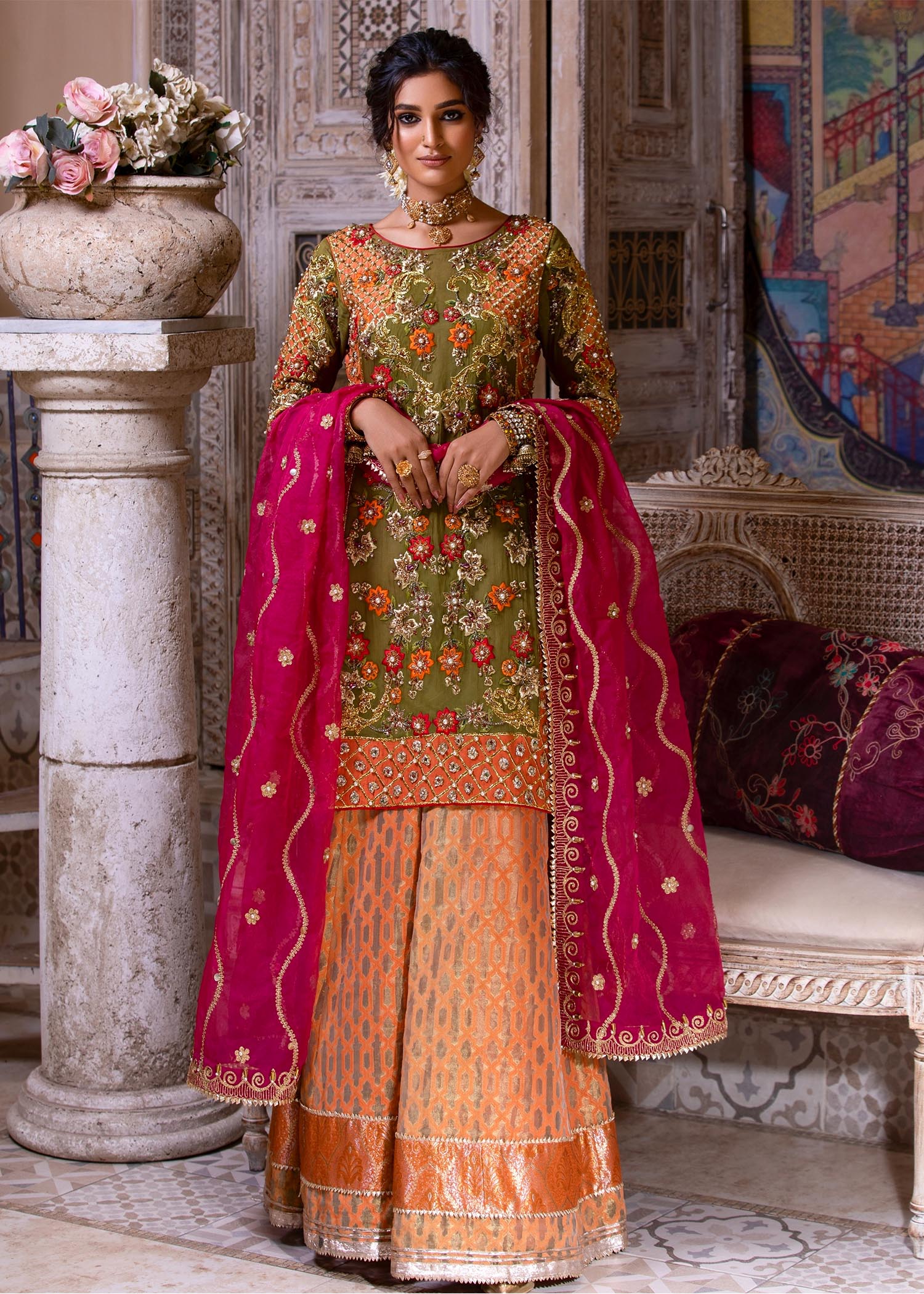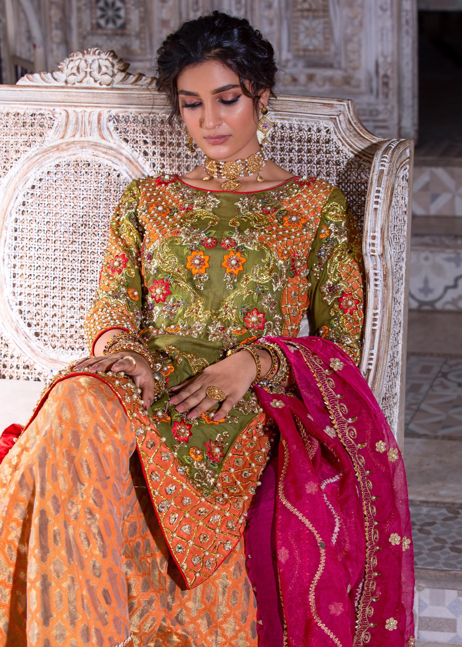 An olive green chiffon embroidered shirt with orange accents, embellished with kora, dabka, nakshi, rehsam, mukesh, and other beautiful intricate materials. Paired with a red net dupatta embroidered with kacha tilla, pearl kinari and gota spray, along with a sharara with gota patti.
