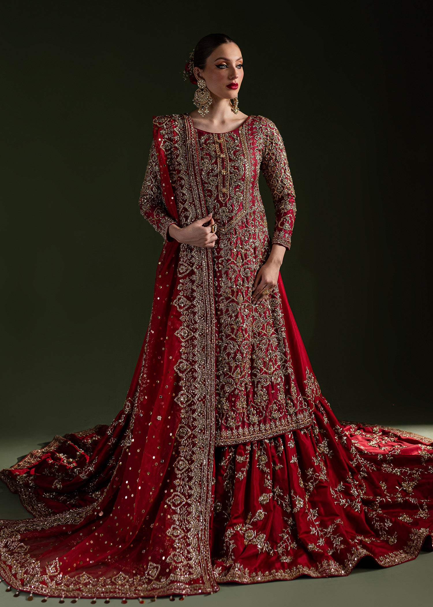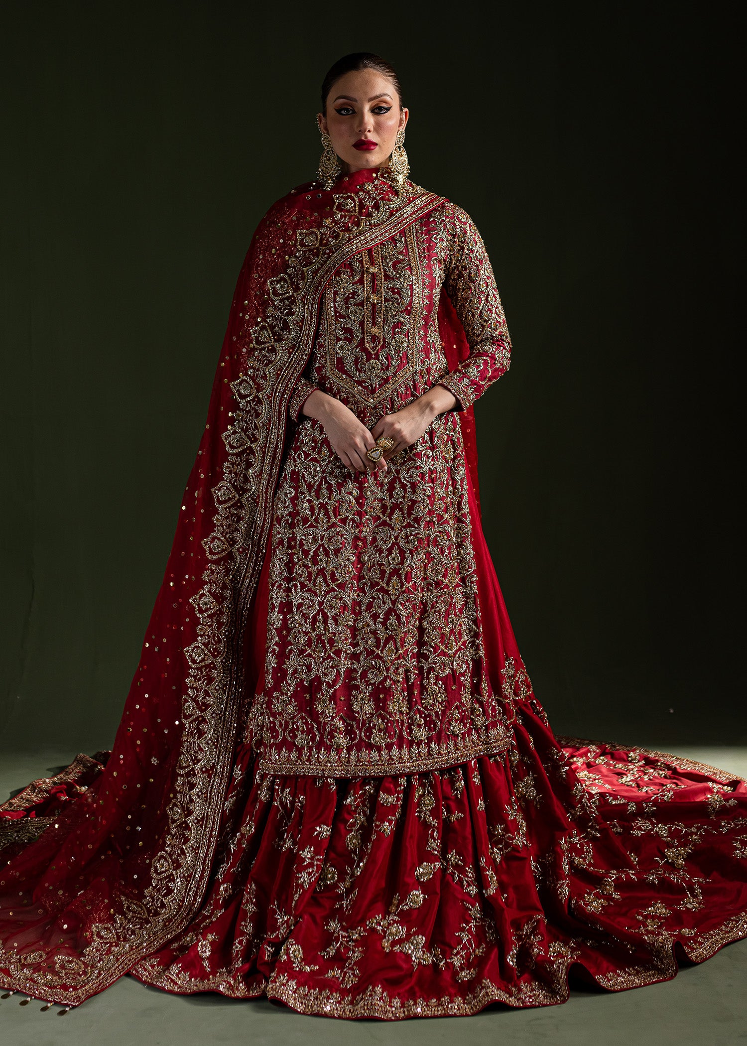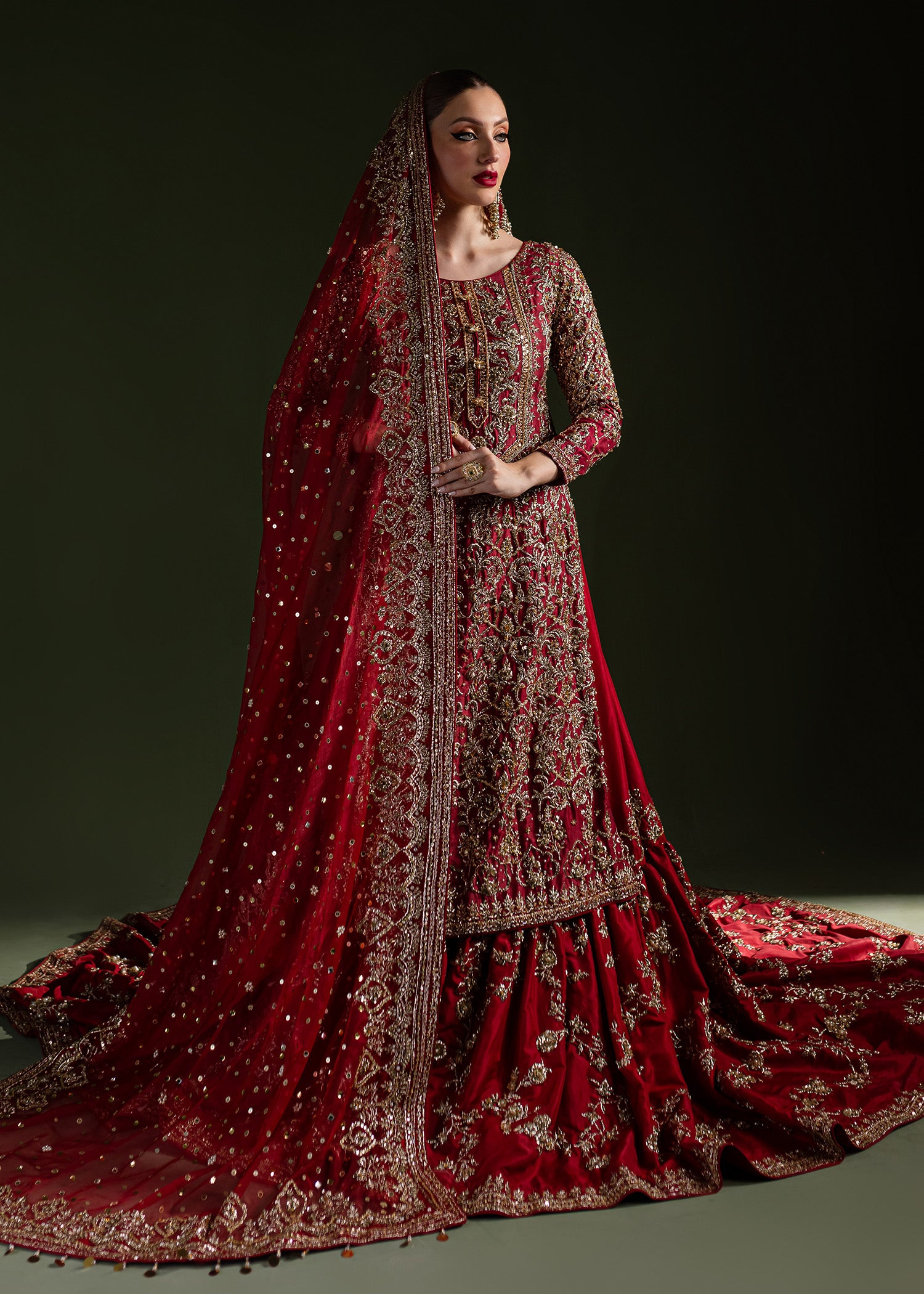 Eastern round neck with incredible mild gold signature mukesh jall, embellished with traditional dabka, naqshi, sequins, gems, and pearls. The scalloped dupatta features a four-sided mukesh and sequins-embellished border, paired with a silk traditional tail farshi lehenga, embellished with signature mild gold all-over jall, enhancing the look. All traditional techniques are executed on a modern palette, creating a contemporary masterpiece.
