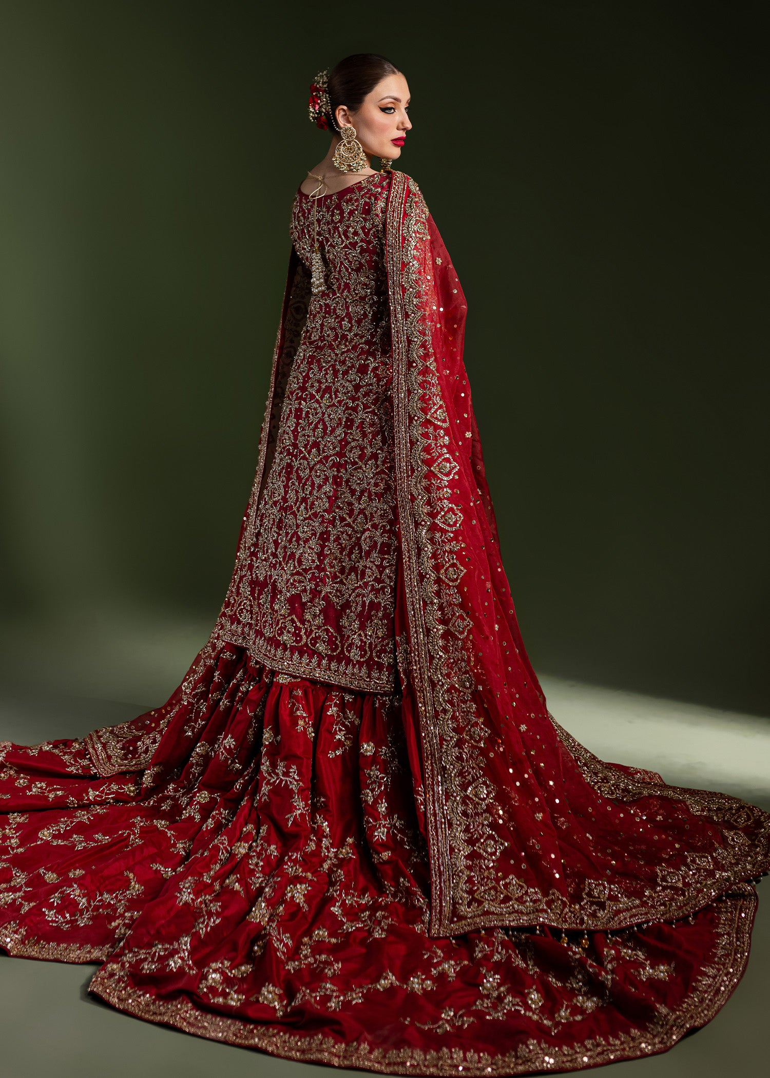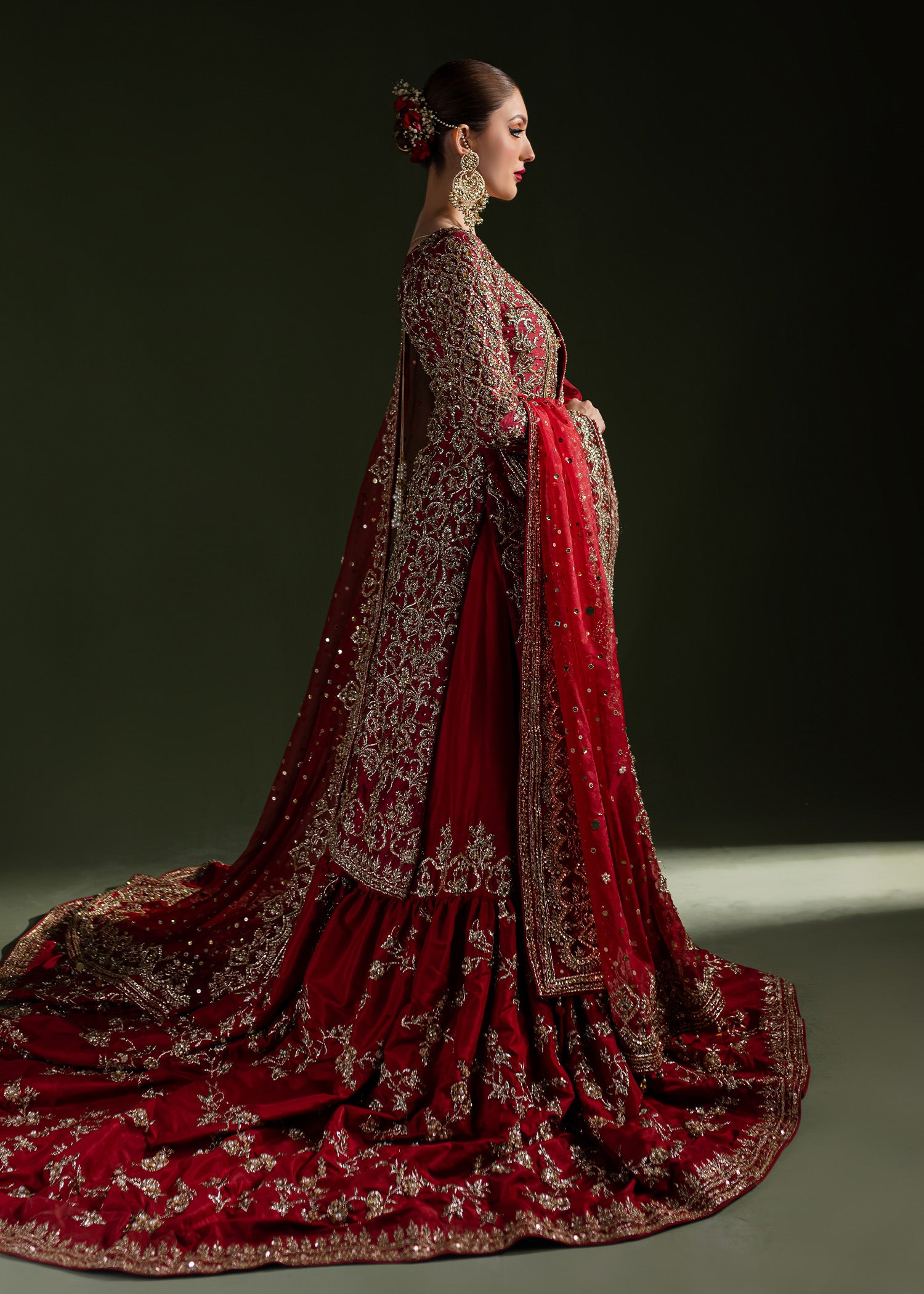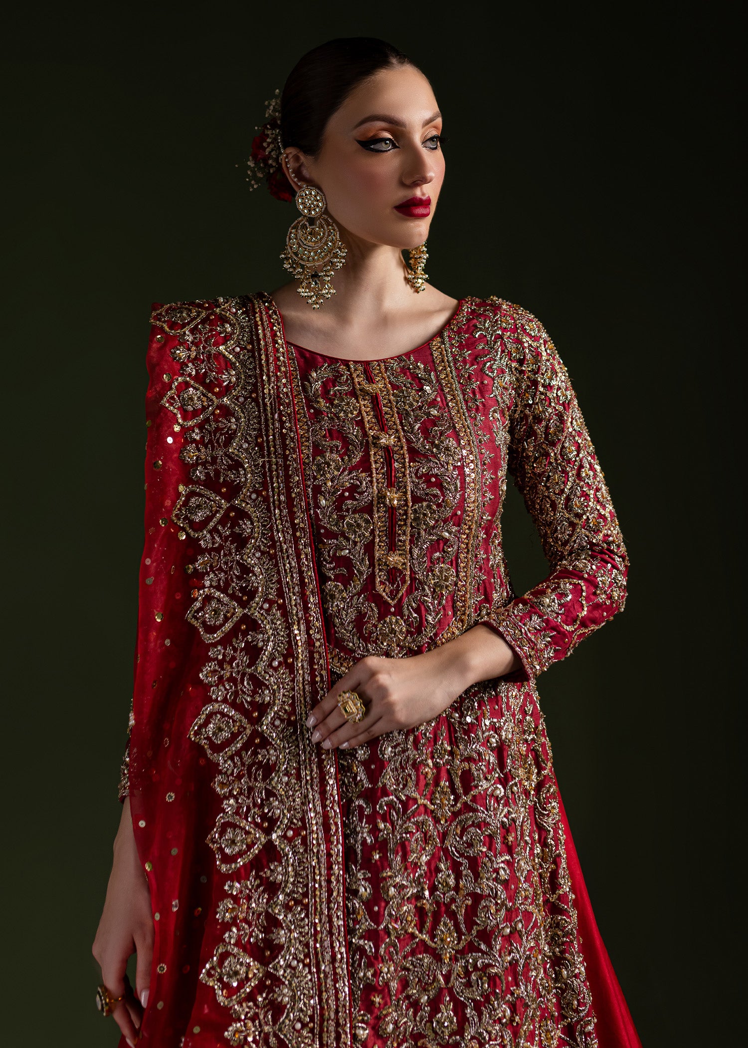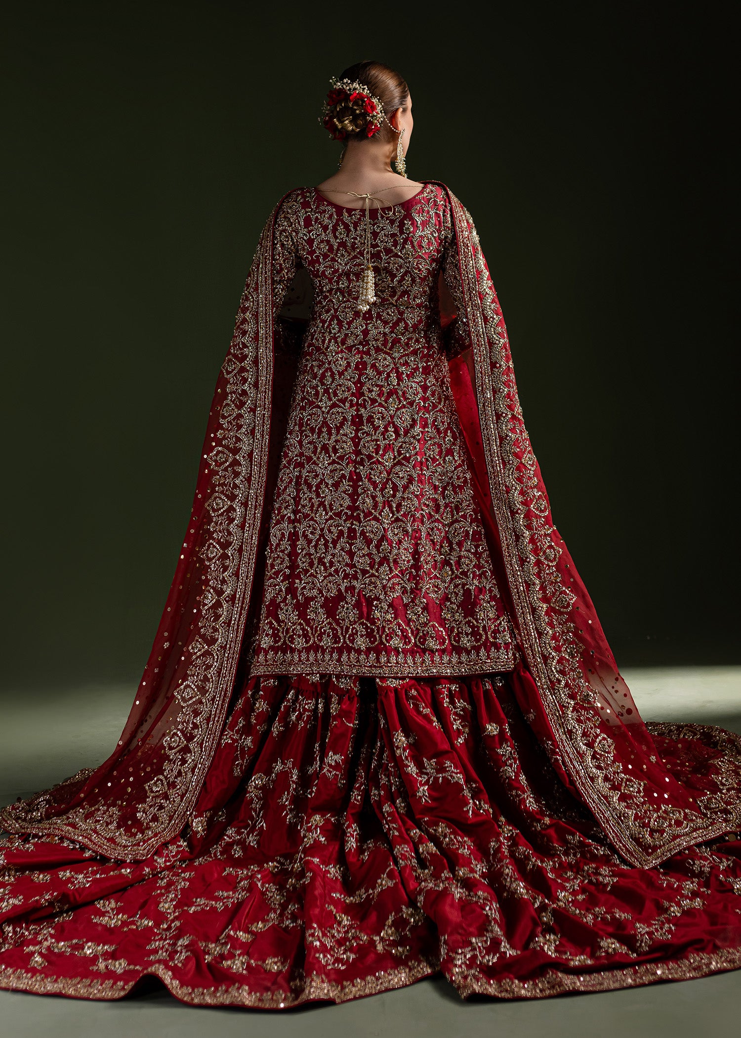 Eastern round neck with incredible mild gold signature mukesh jall, embellished with traditional dabka, naqshi, sequins, gems, and pearls. The scalloped dupatta features a four-sided mukesh and sequins-embellished border, paired with a silk traditional tail farshi lehenga, embellished with signature mild gold all-over jall, enhancing the look. All traditional techniques are executed on a modern palette, creating a contemporary masterpiece.