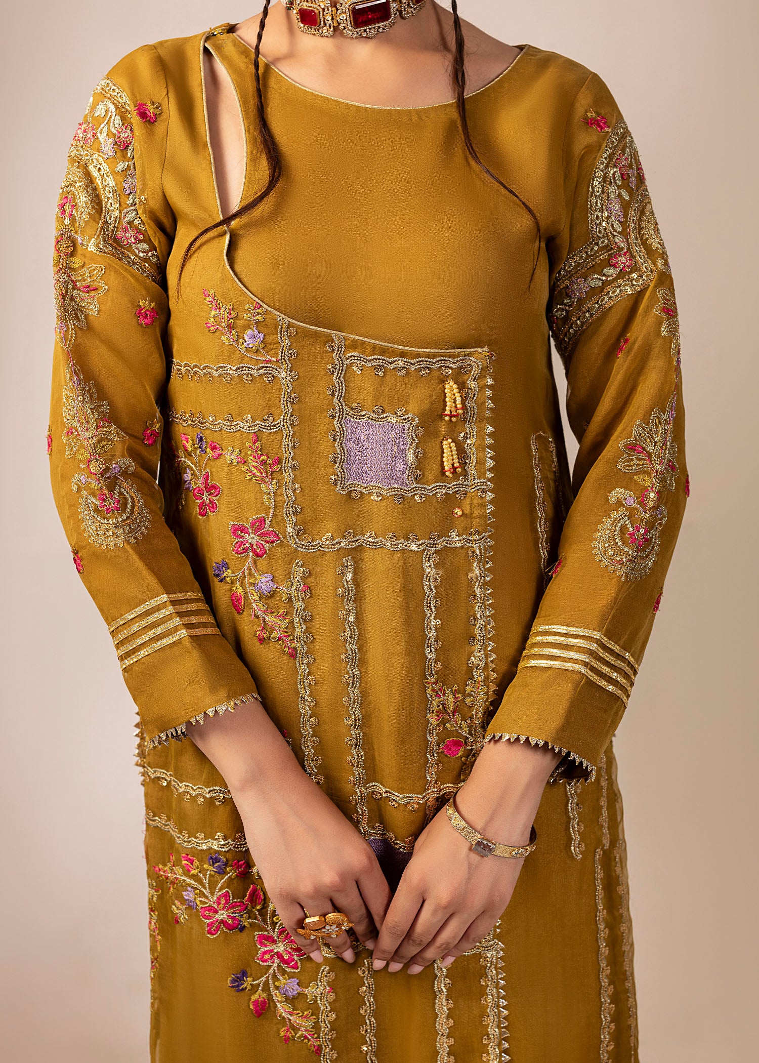 Product Description: Discover timeless grace in this alluring mustard-toned angrakha gown, meticulously crafted with a body-cut silhouette. The entire ensemble radiates sophistication through its elaborate tilla embroidery and brilliant sequin work, featuring a unique fusion of blooming floral designs and modern square motifs. It comes complete with a translucent matching dupatta, subtly embellished with its own shimmering details, offering an exquisite balance of heritage artistry and contemporary flair.