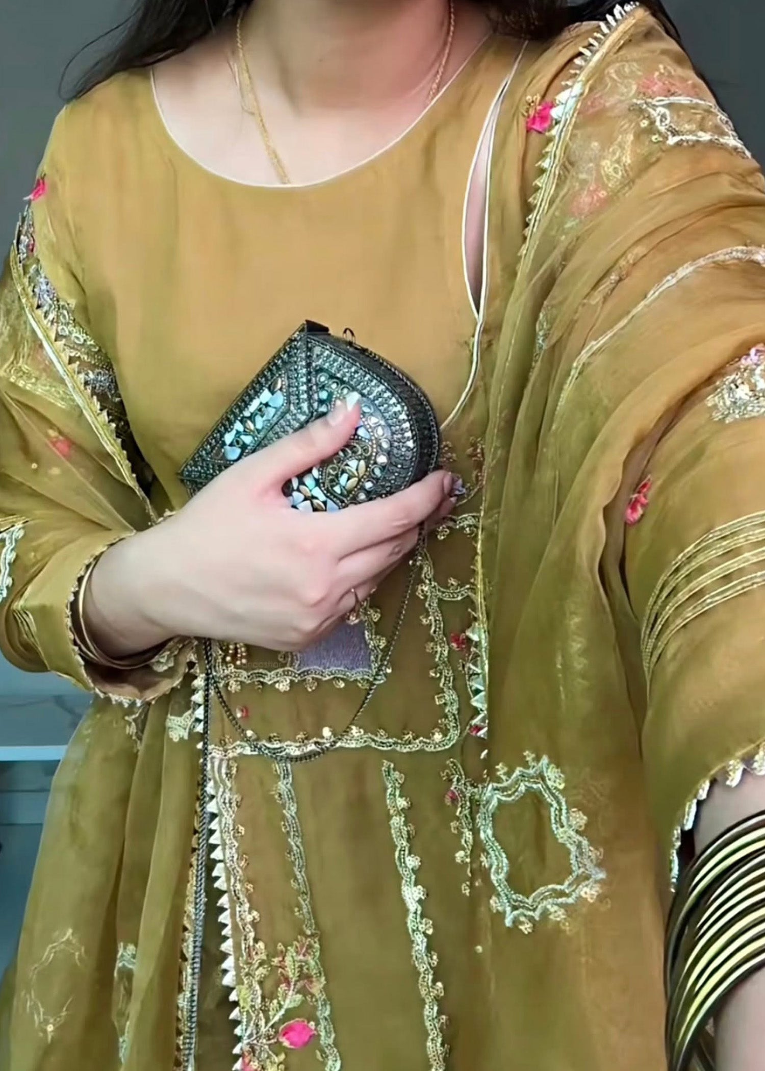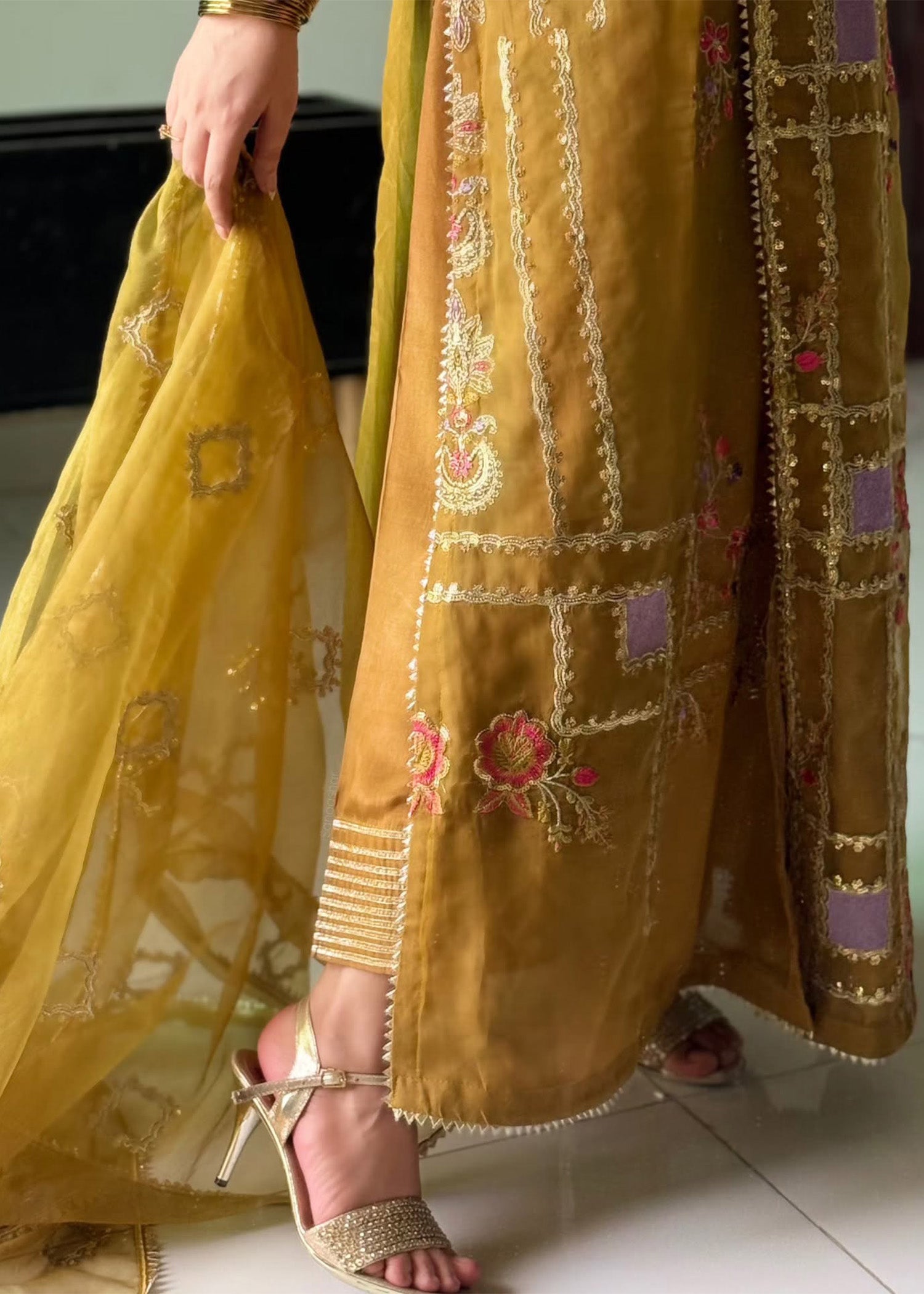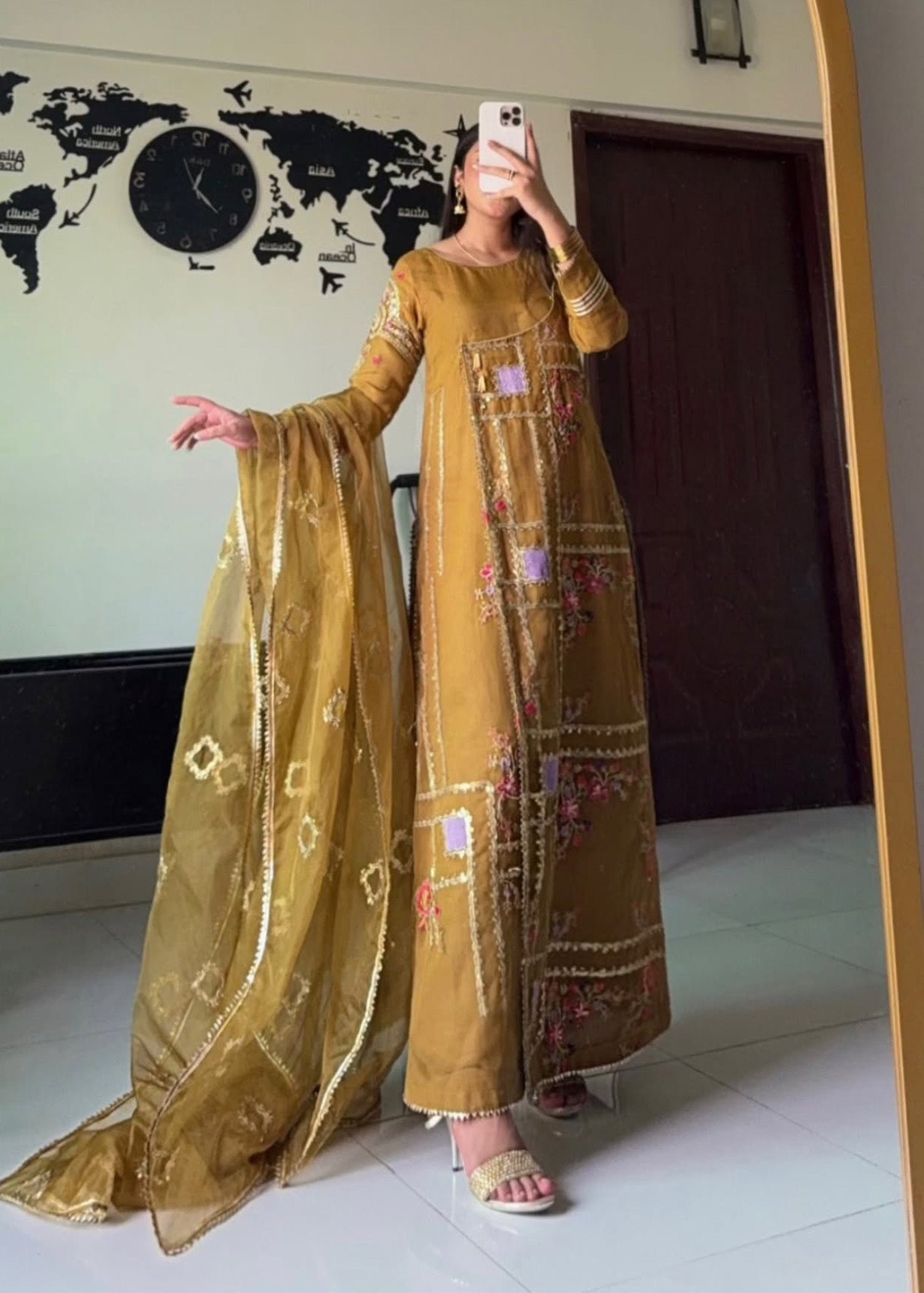 Product Description: Discover timeless grace in this alluring mustard-toned angrakha gown, meticulously crafted with a body-cut silhouette. The entire ensemble radiates sophistication through its elaborate tilla embroidery and brilliant sequin work, featuring a unique fusion of blooming floral designs and modern square motifs. It comes complete with a translucent matching dupatta, subtly embellished with its own shimmering details, offering an exquisite balance of heritage artistry and contemporary flair.