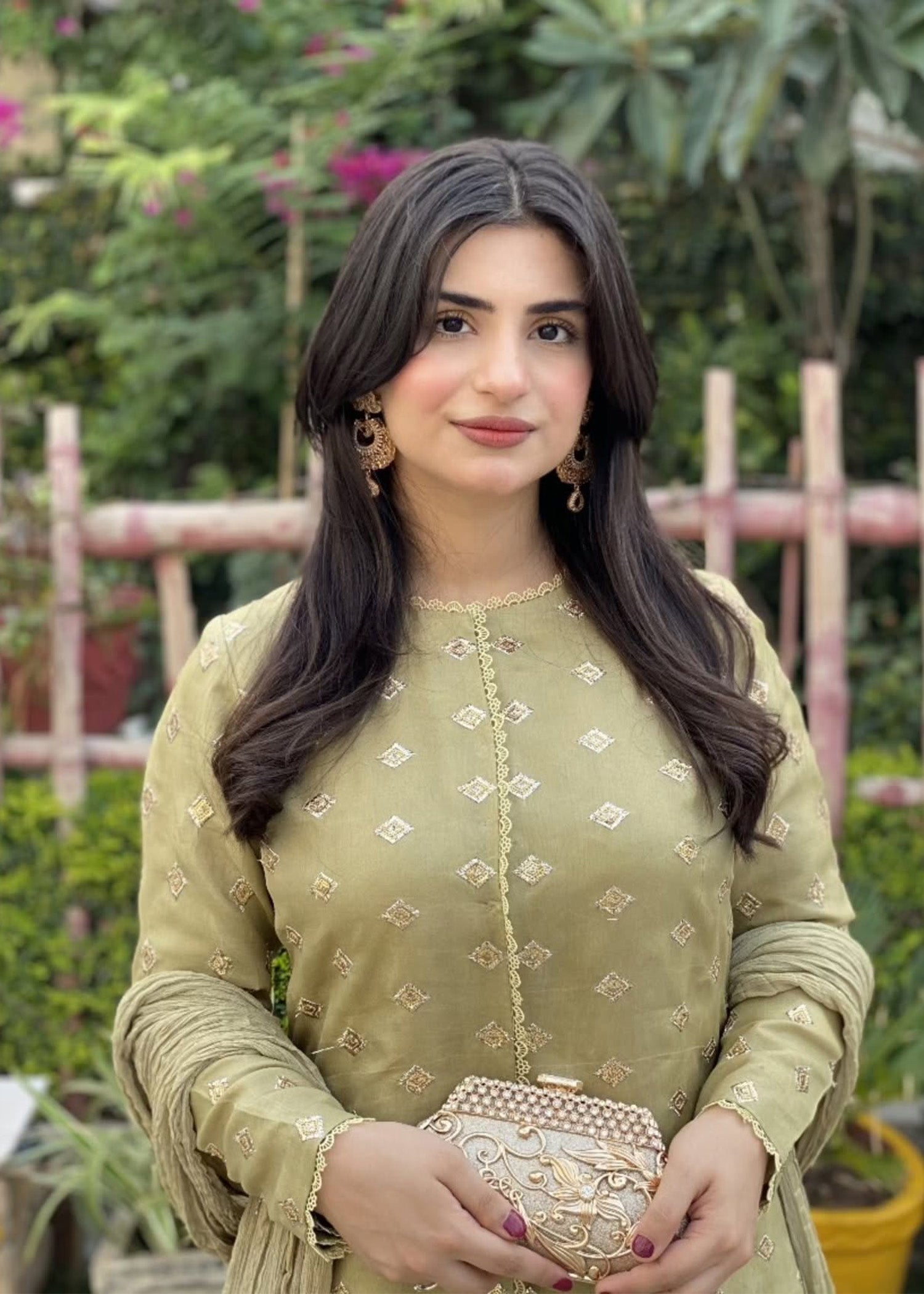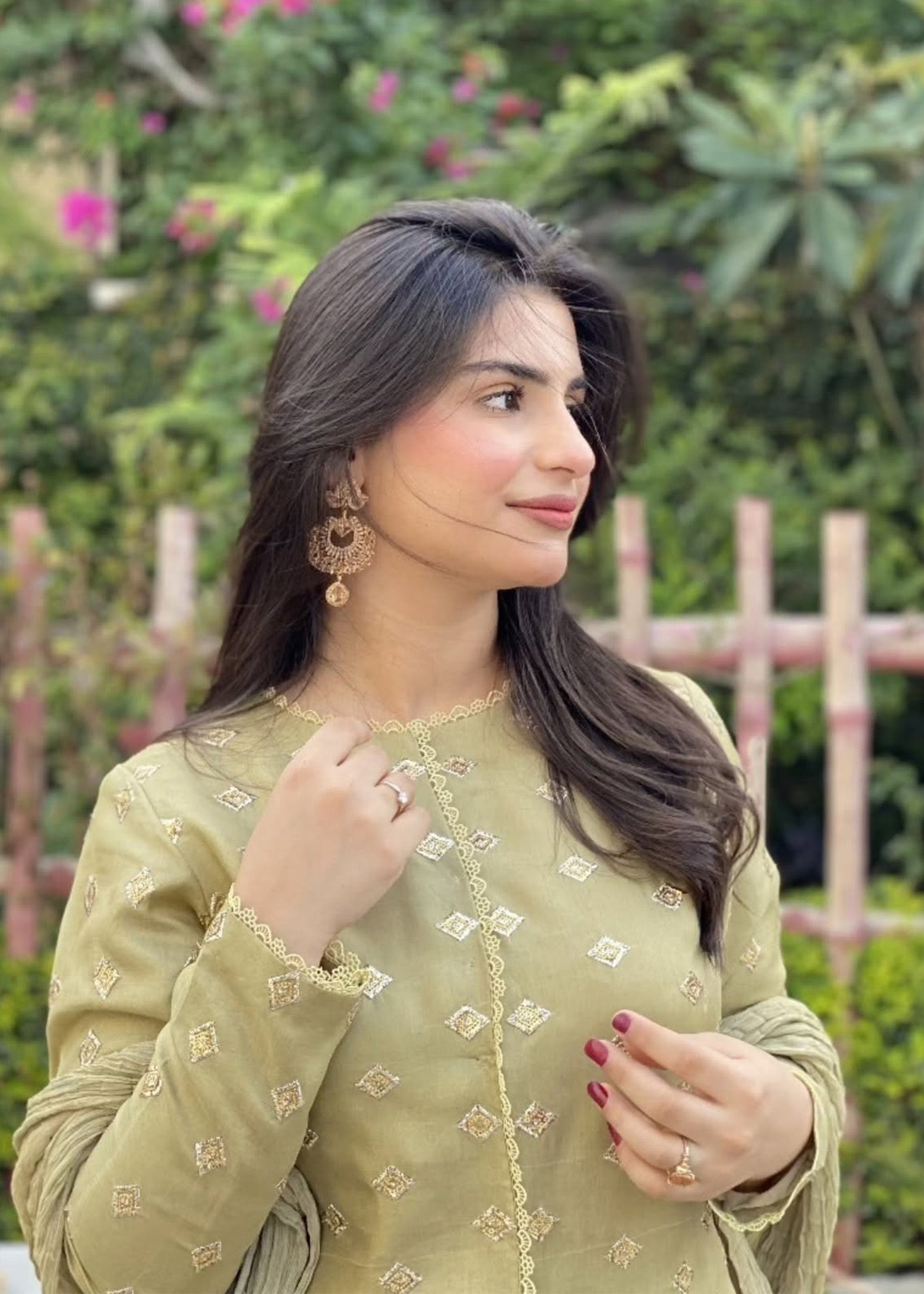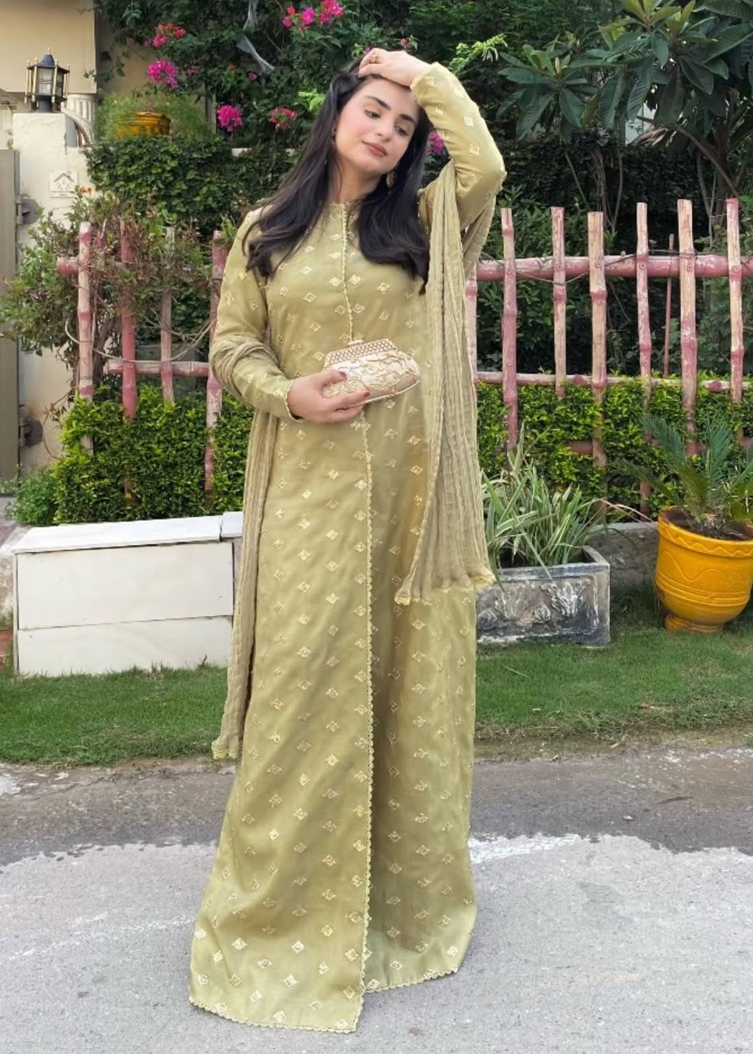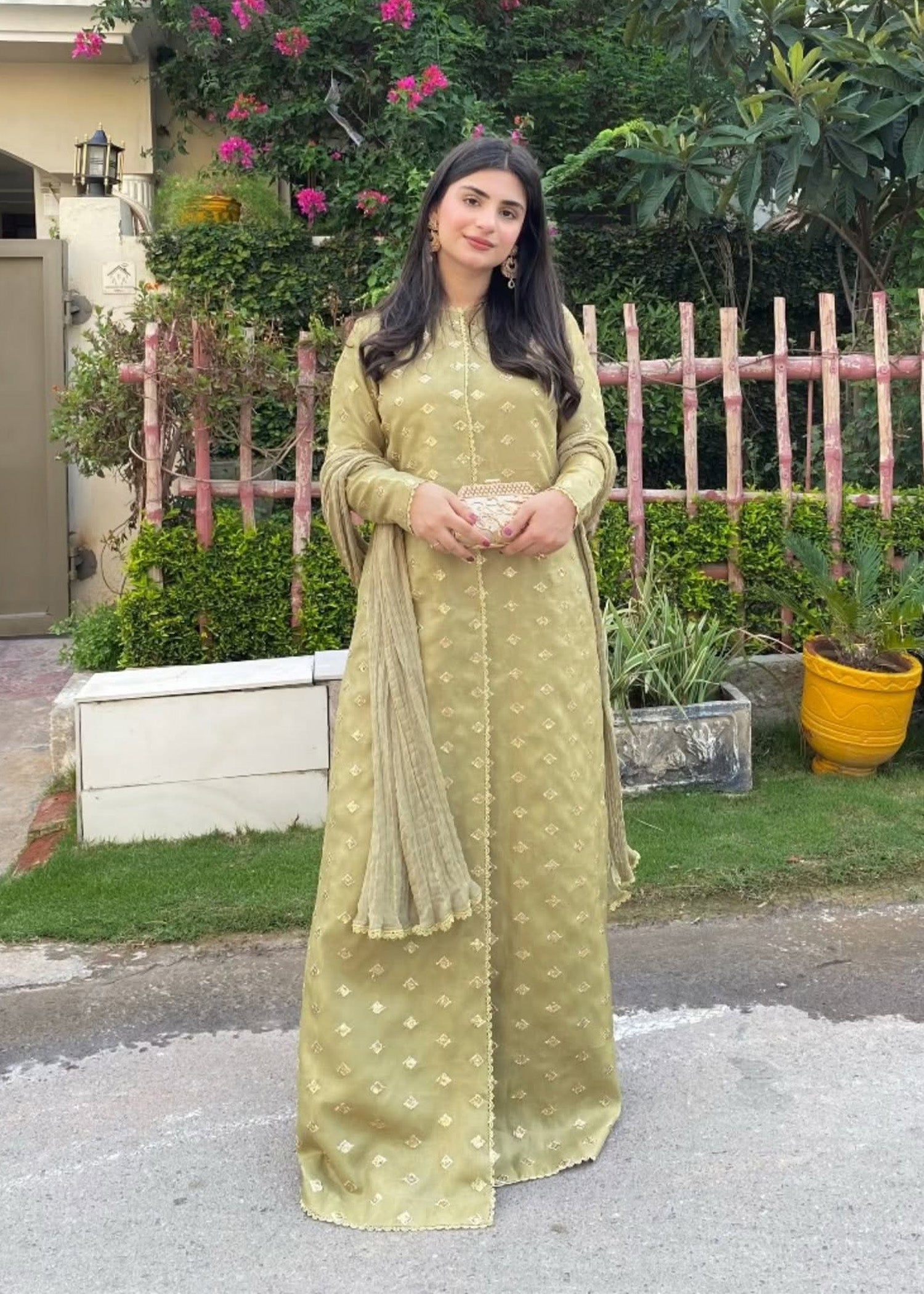 Product Description: Gracefully designed, this full-body olive-green gown showcases a subtle scattering of intricate embroidery and sequin work, lending it a refined texture. It's perfectly complemented by straight trousers and a delicate, flowing crushed chiffon dupatta, completing this elegantly understated ensemble.