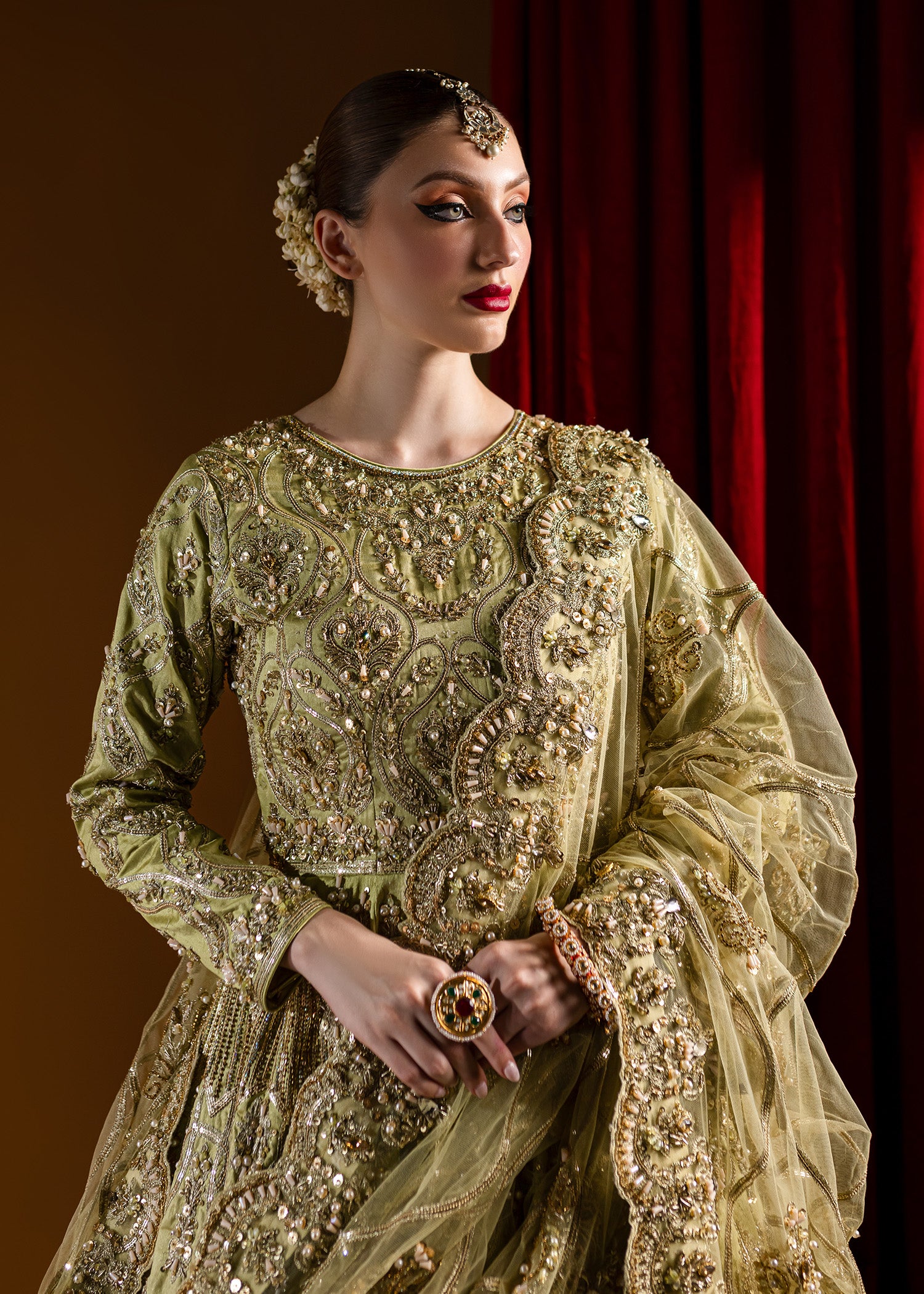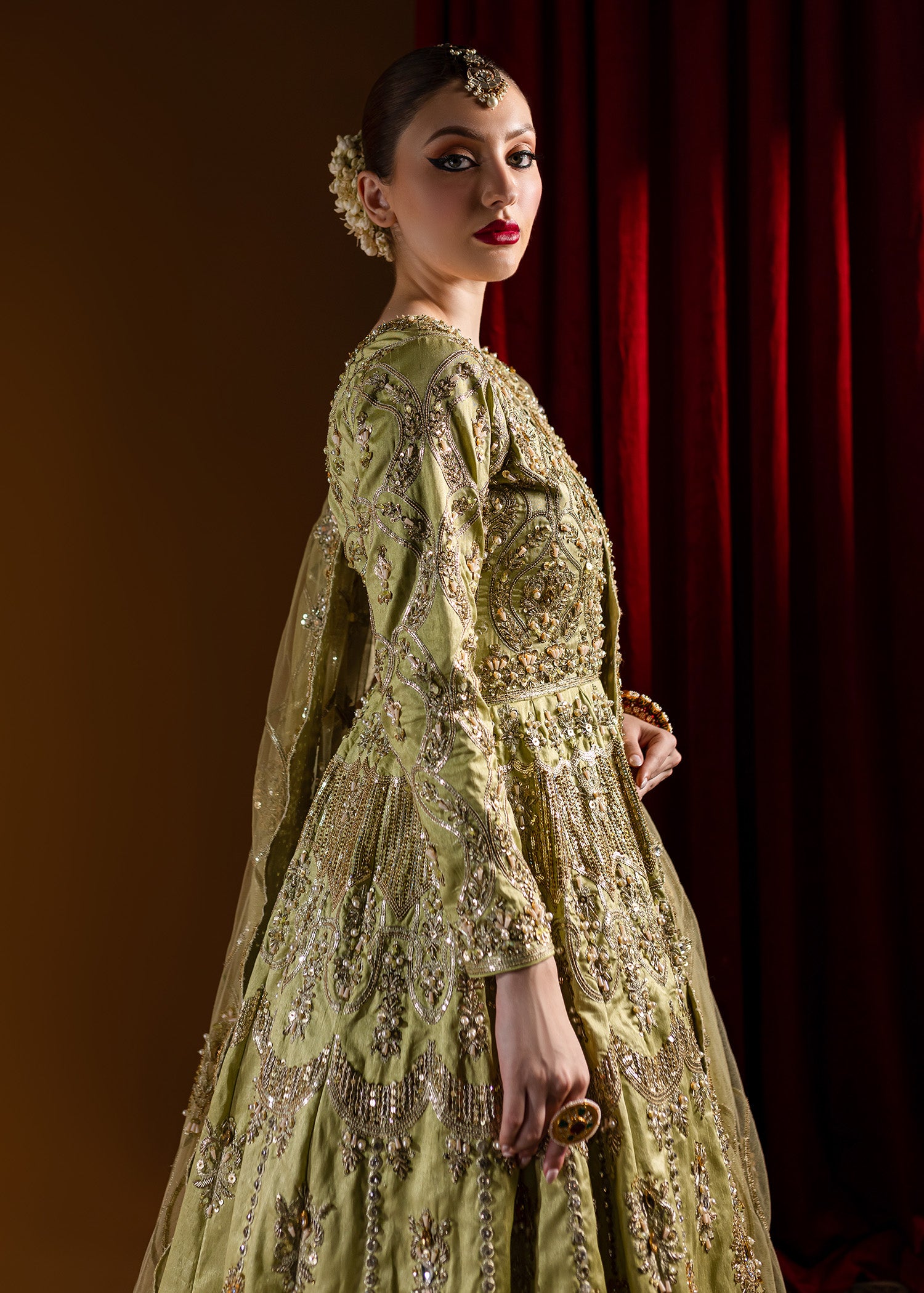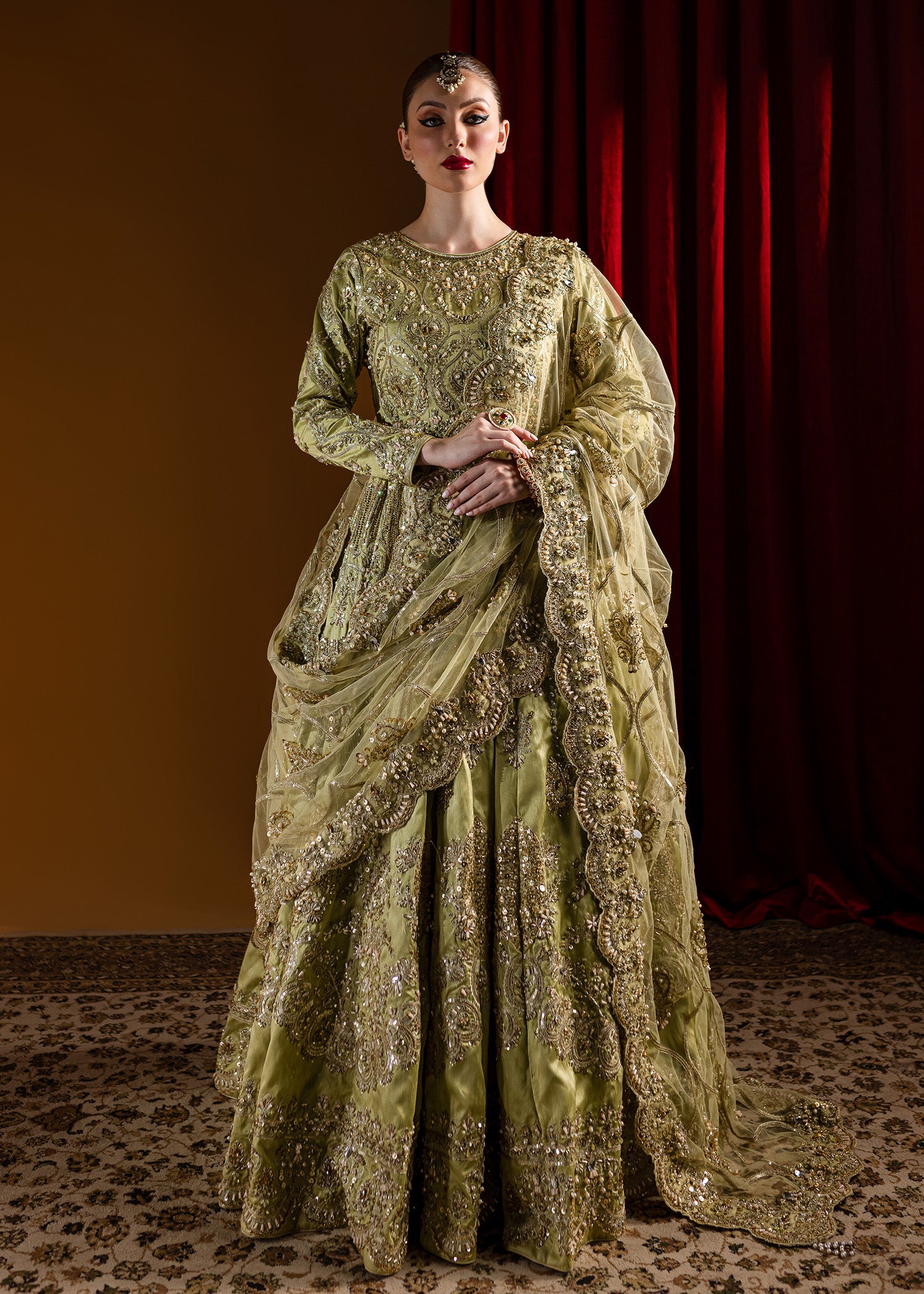 Modern fitted round-shaped pishwas with incredible mild wire jall, embellished with traditional dabka, naqshi, sequins, gems, and pearls. The scalloped dupatta features a four-sided mild gold tilla wire tanka border, with an all-over bunch pattern enhancing the look. All traditional techniques are executed on a modern palette, creating a contemporary masterpiece.