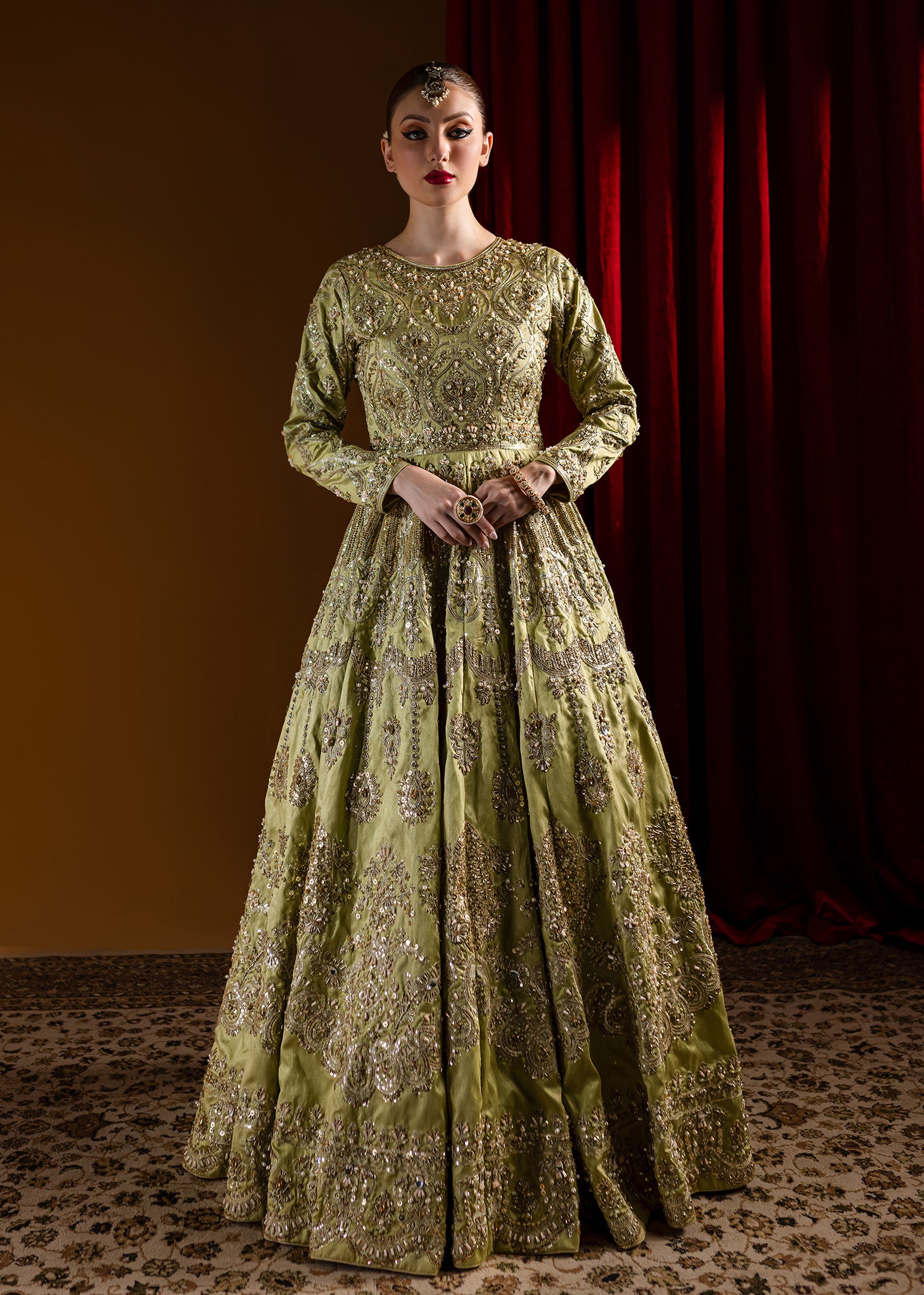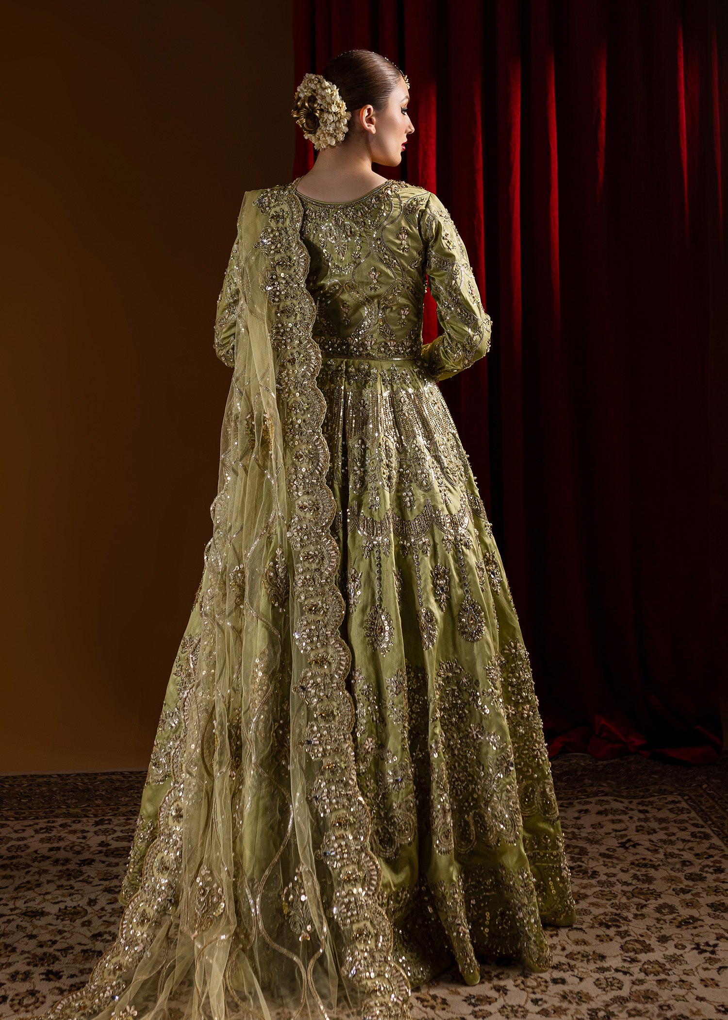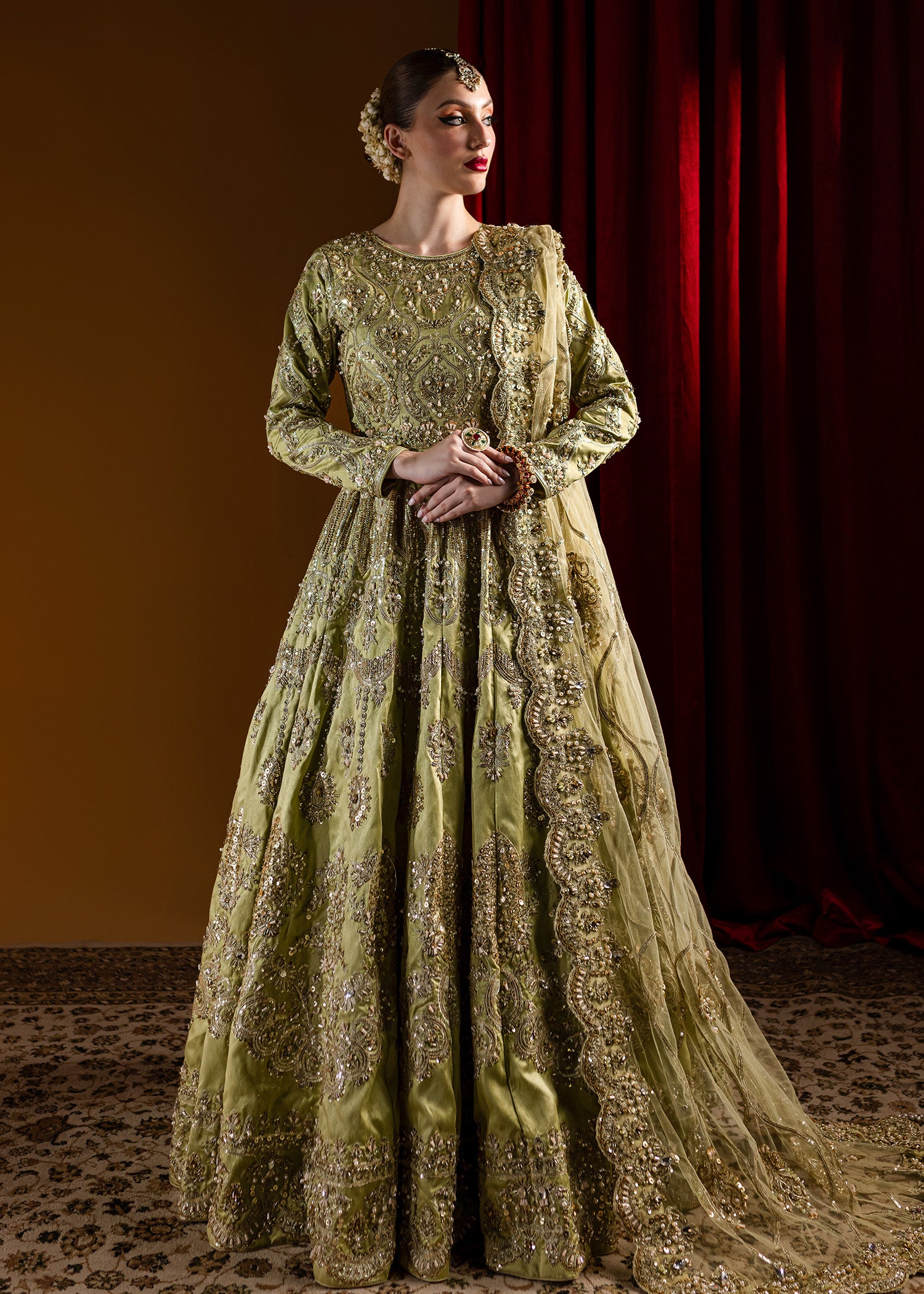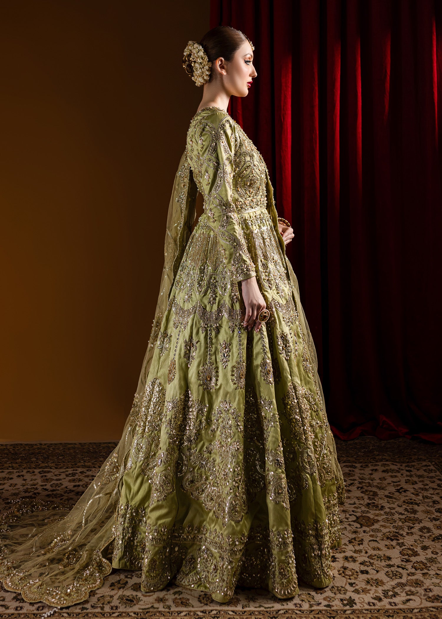 Modern fitted round-shaped pishwas with incredible mild wire jall, embellished with traditional dabka, naqshi, sequins, gems, and pearls. The scalloped dupatta features a four-sided mild gold tilla wire tanka border, with an all-over bunch pattern enhancing the look. All traditional techniques are executed on a modern palette, creating a contemporary masterpiece.