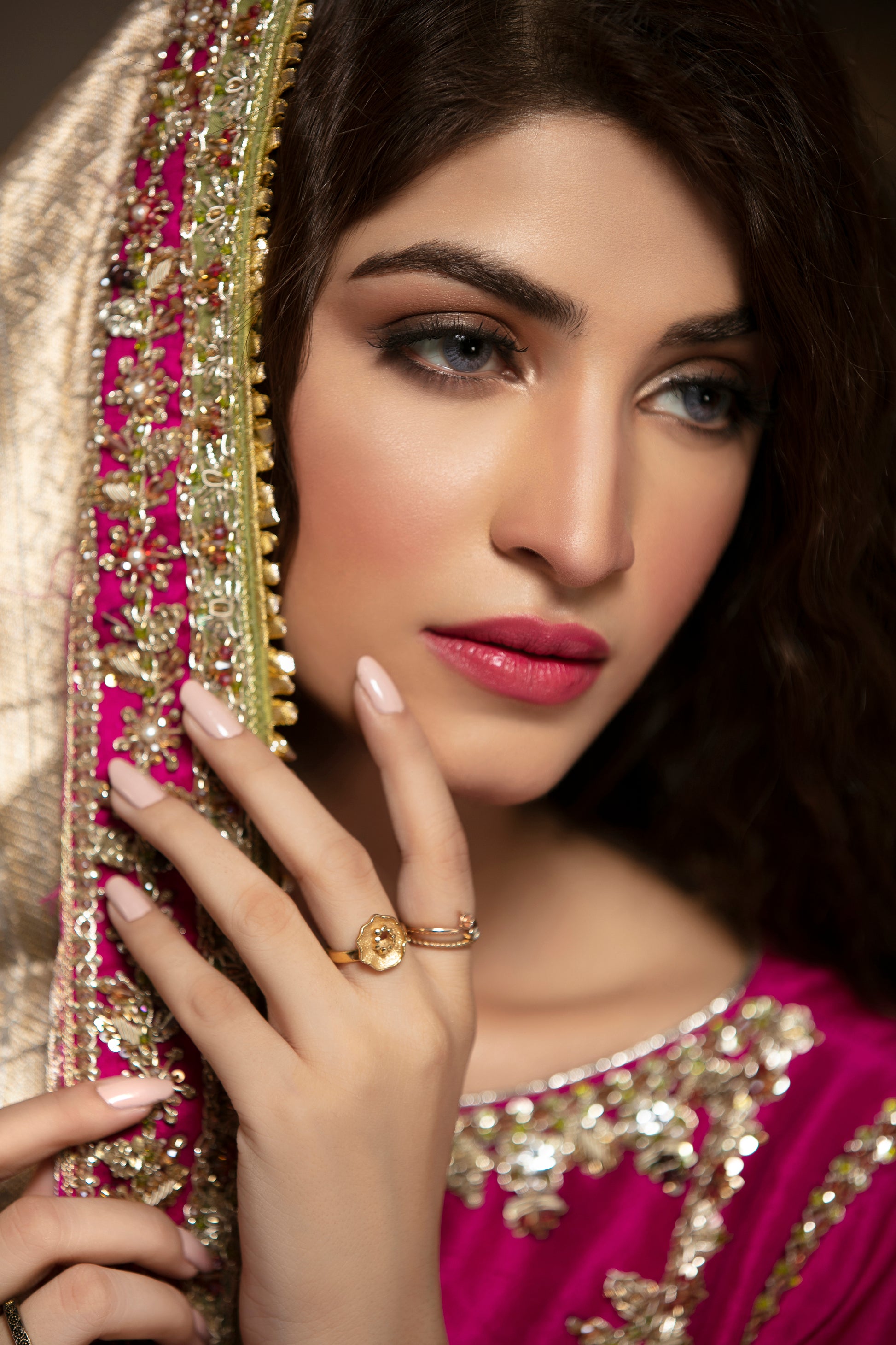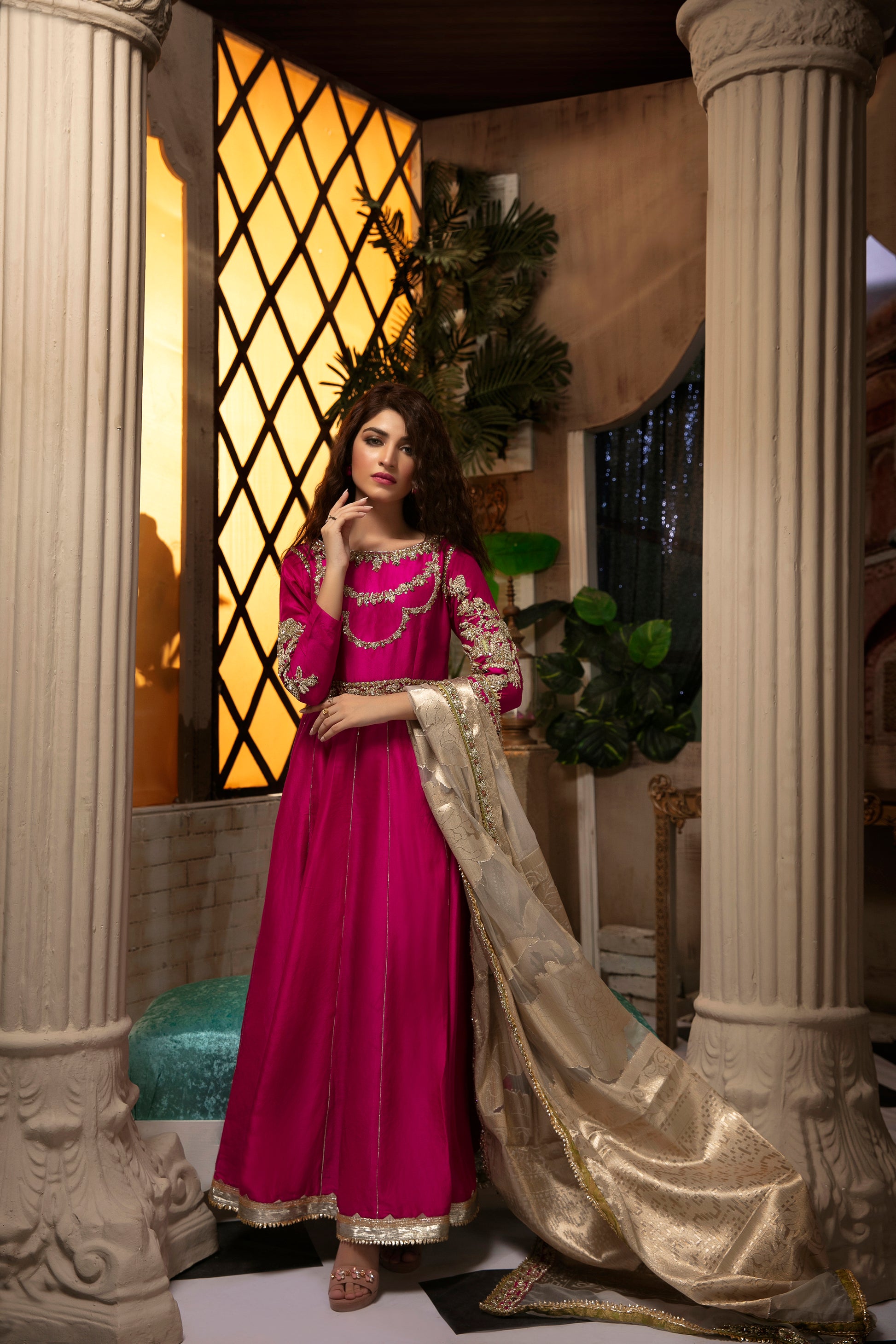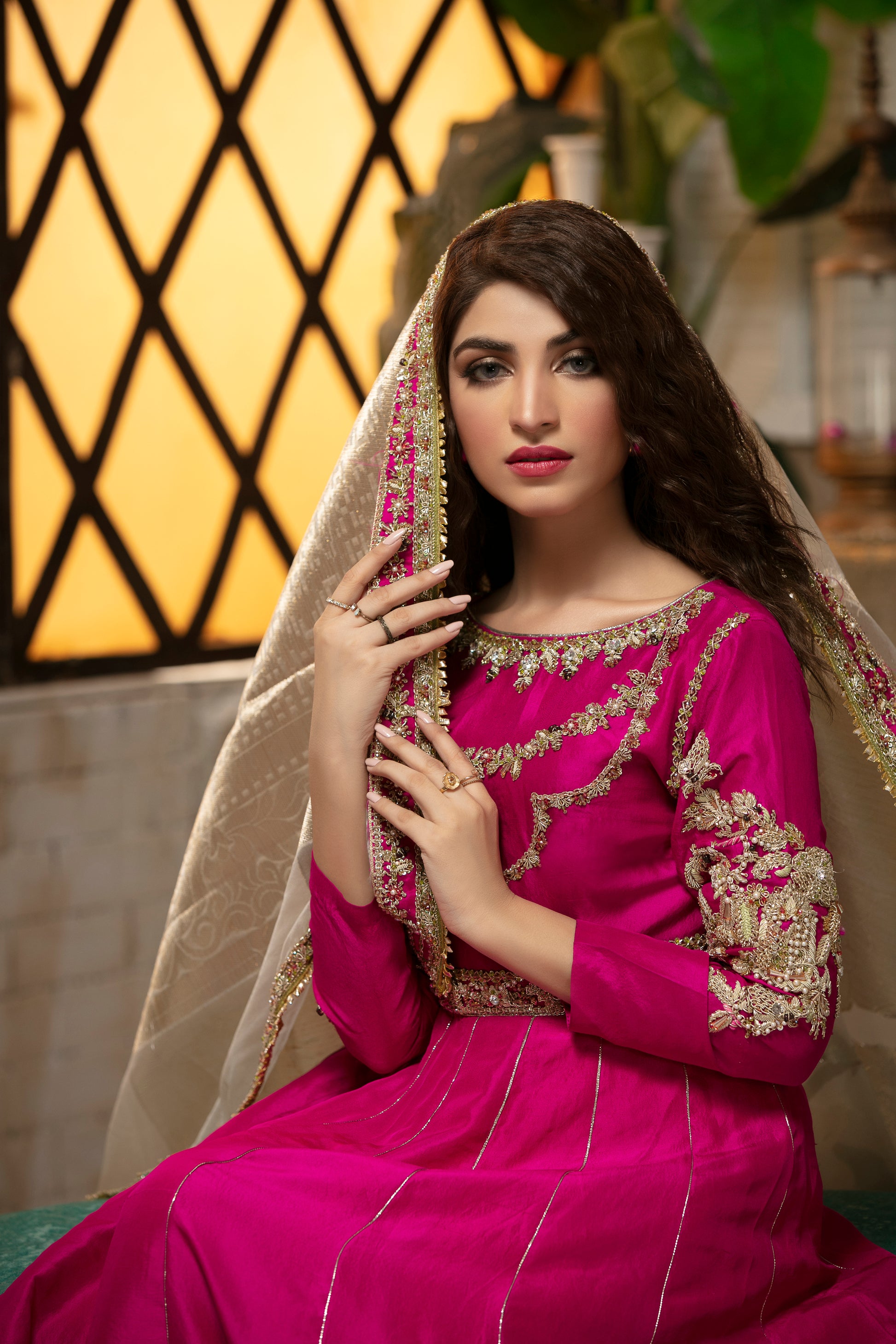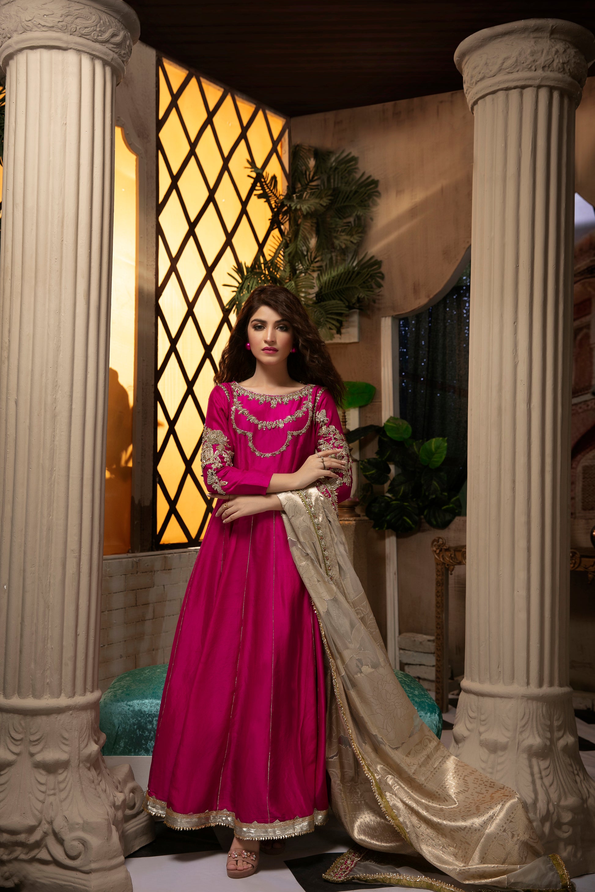 The fuchsia pishwas does not announce—it commands. Its silk body, struck through with threads of silver, rises like a flame disciplined into form. The embroidery at the neckline and sleeves is not mere ornament; it is armor—crafted in gold to blur the line between allure and dominion.