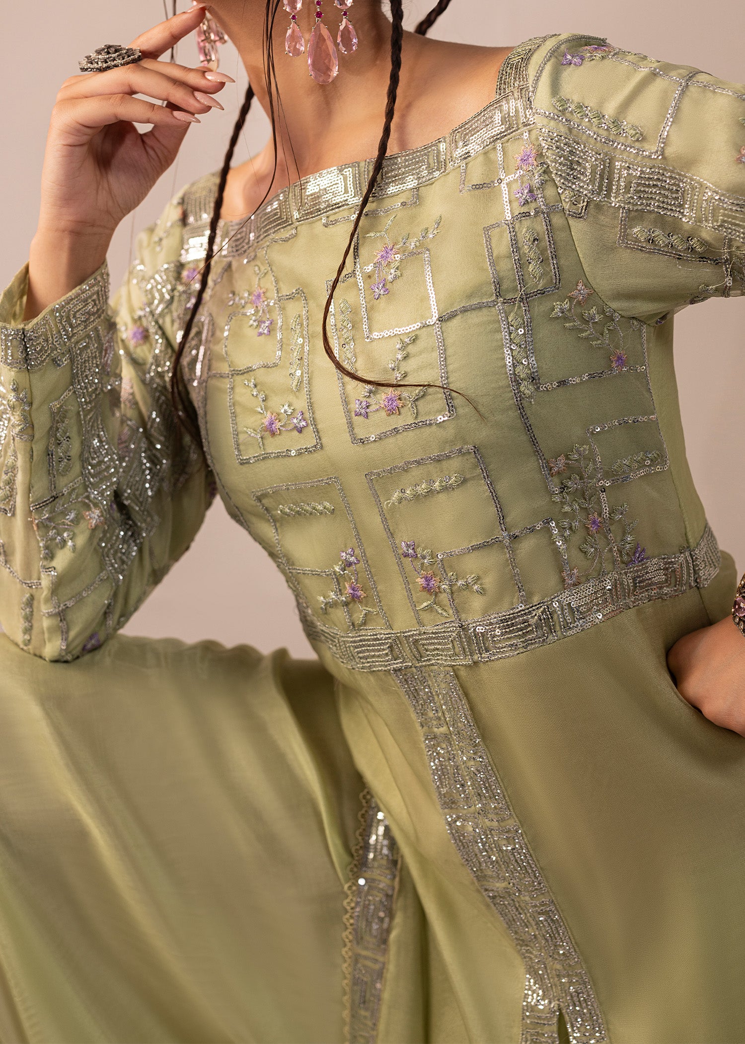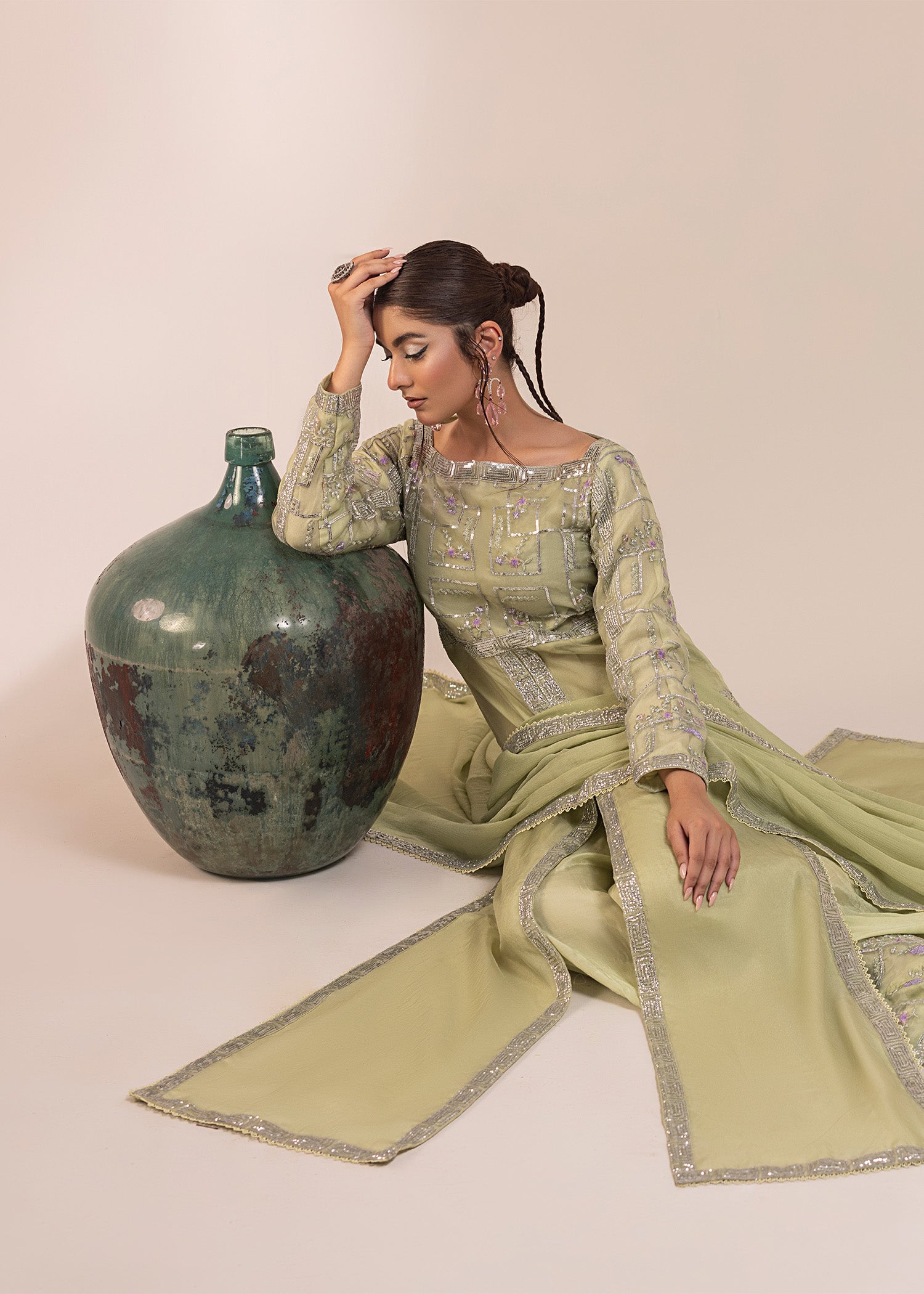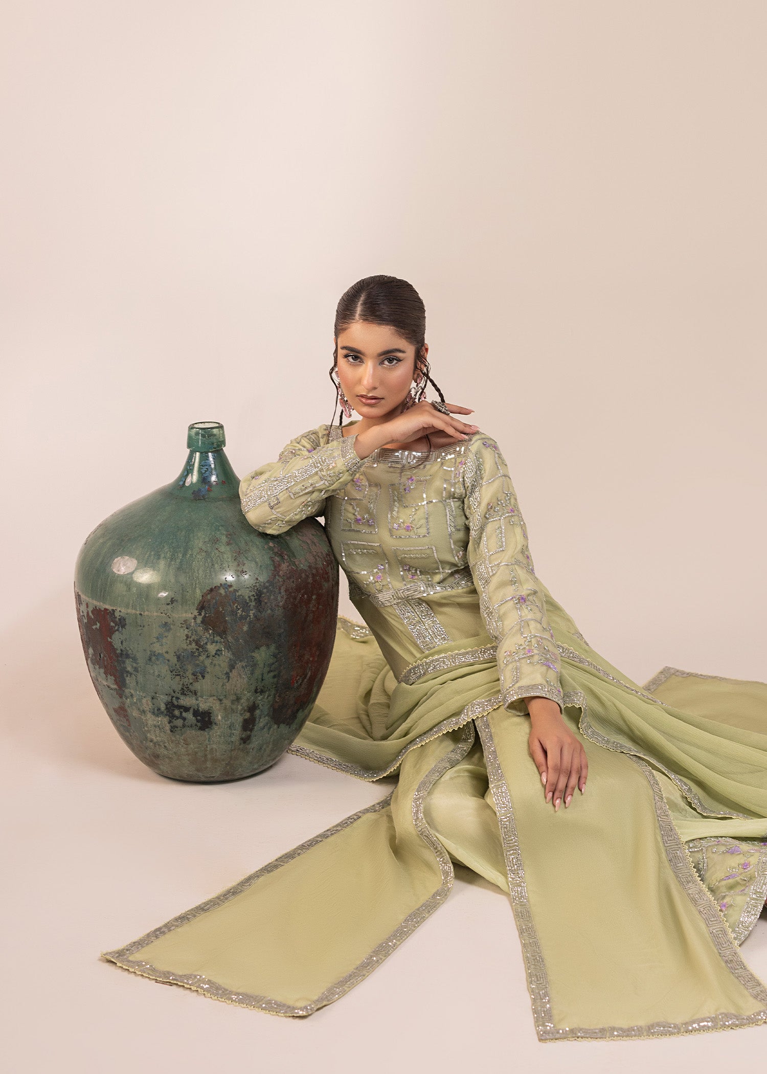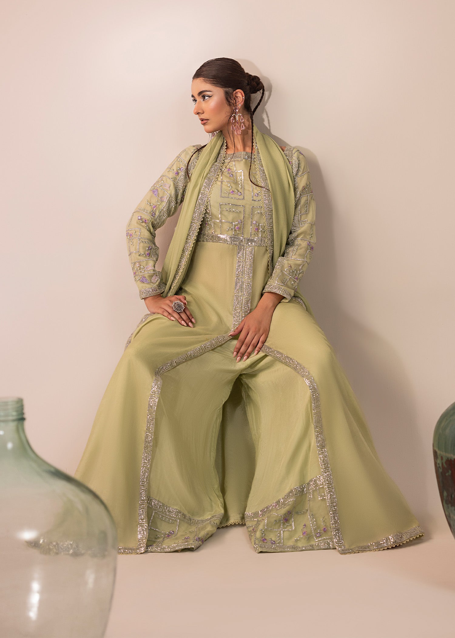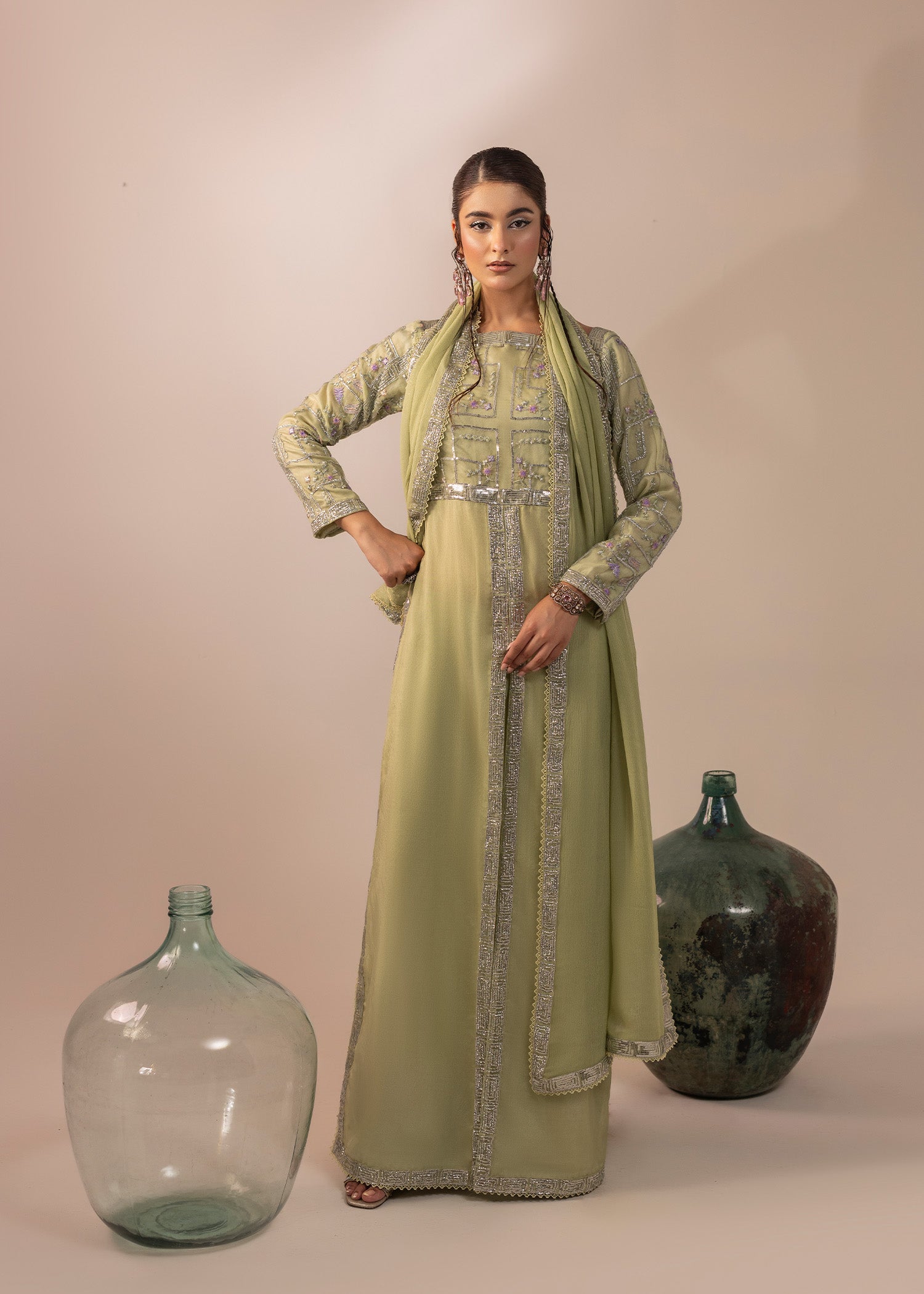 Product Description: A pistachio green front-open gown beautifully embellished with tilla embroidery and delicate sequins. The square neckline and long sleeves lend it an elegant charm. Paired with flared pants featuring detailed embroidery at the hem. The look is completed with a matching dupatta edged in sequins. A refined ensemble perfect for festive and formal occasions.