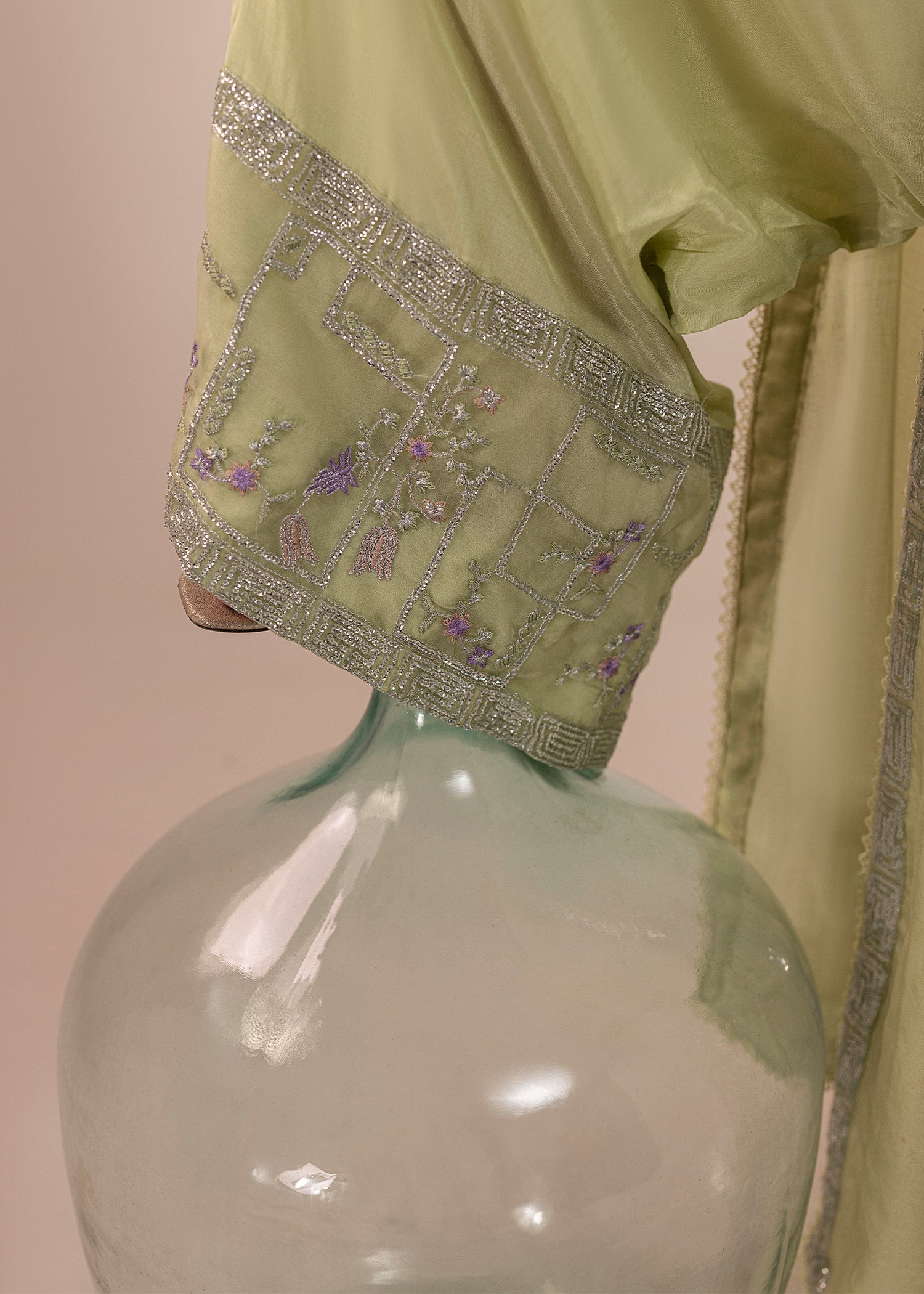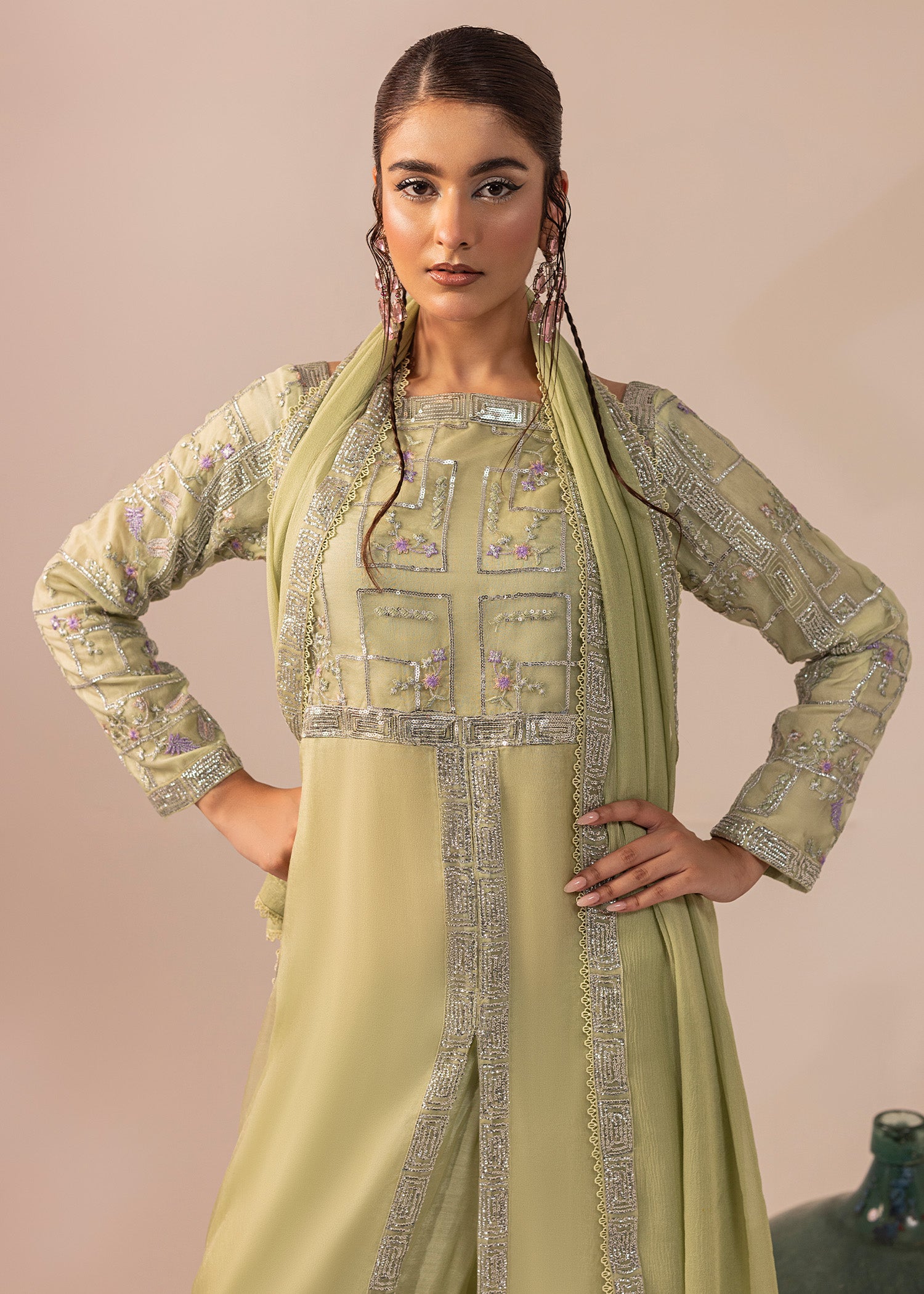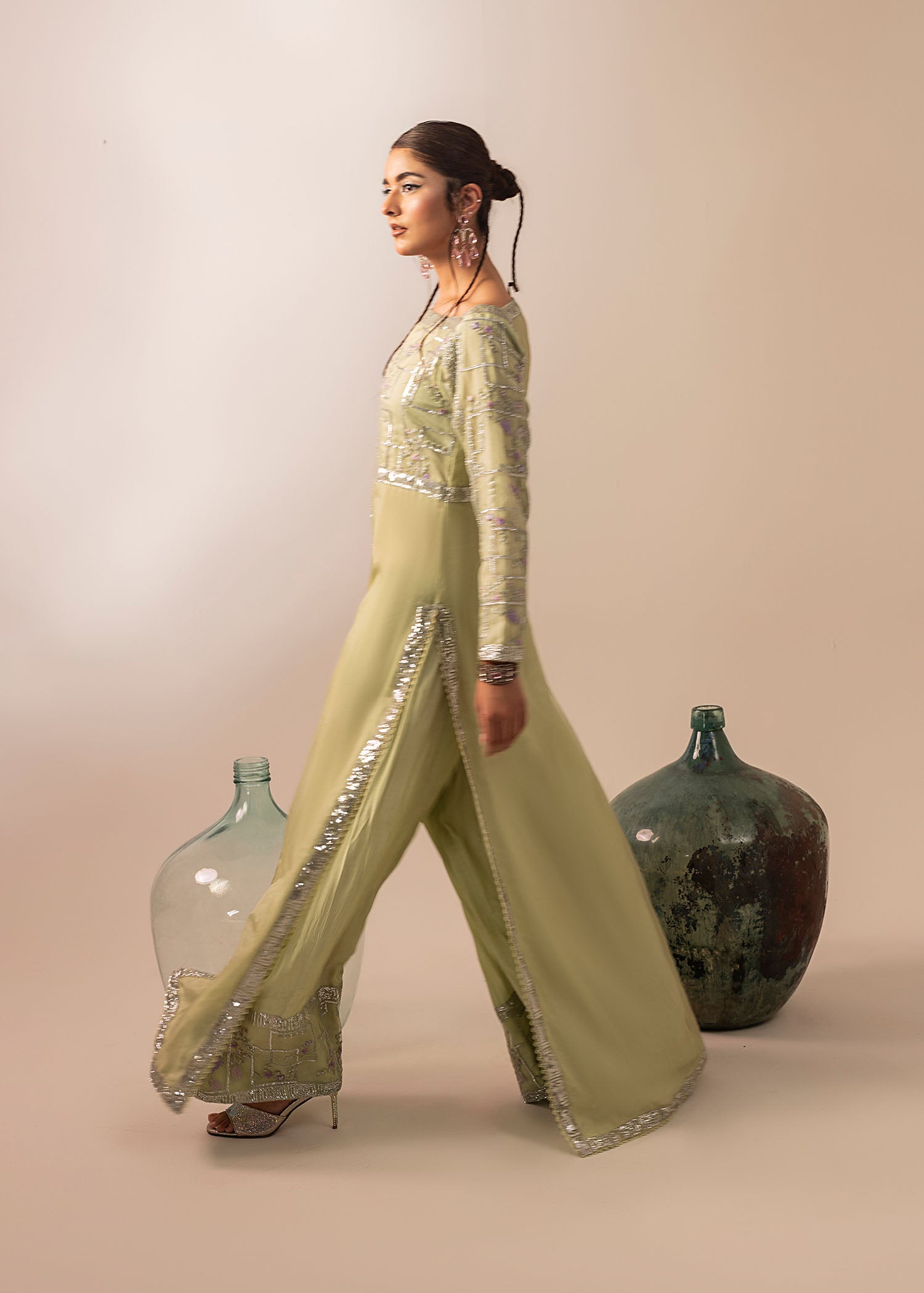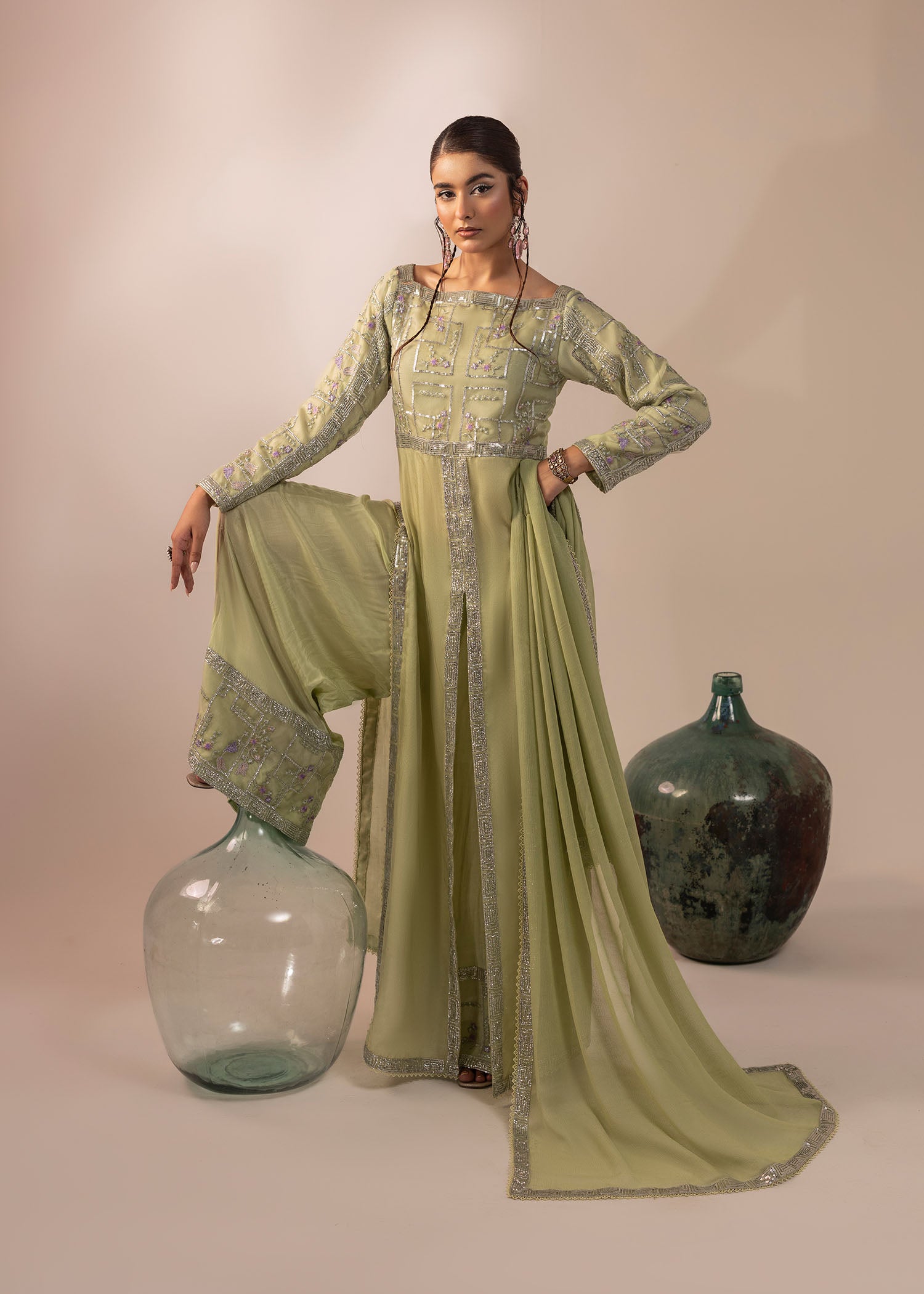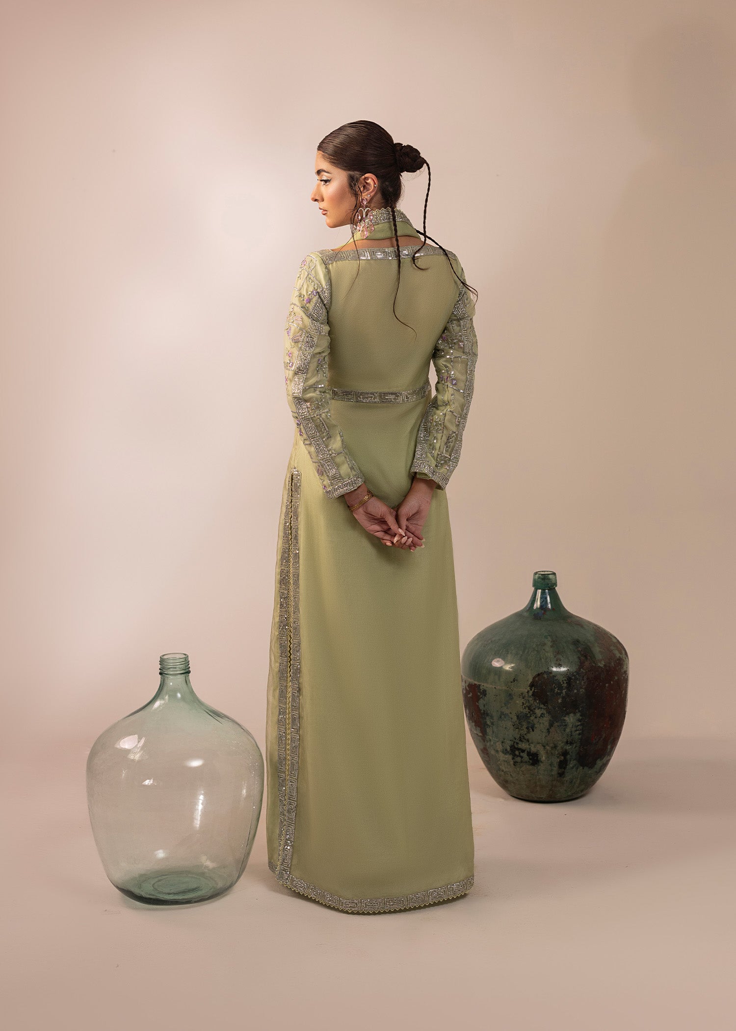 Product Description: A pistachio green front-open gown beautifully embellished with tilla embroidery and delicate sequins. The square neckline and long sleeves lend it an elegant charm. Paired with flared pants featuring detailed embroidery at the hem. The look is completed with a matching dupatta edged in sequins. A refined ensemble perfect for festive and formal occasions.