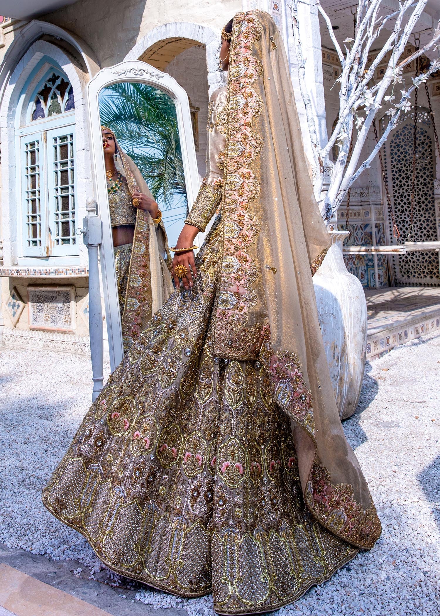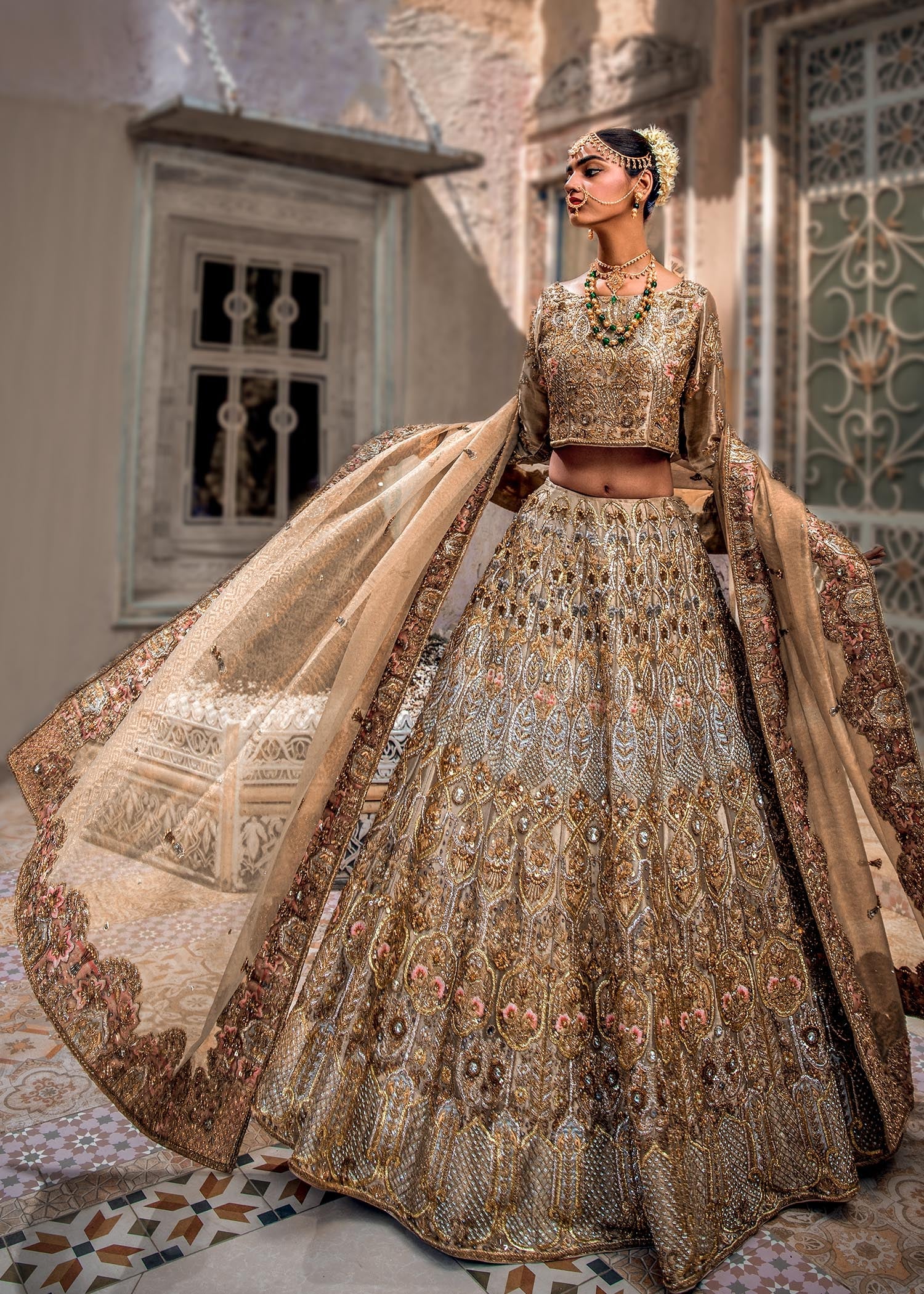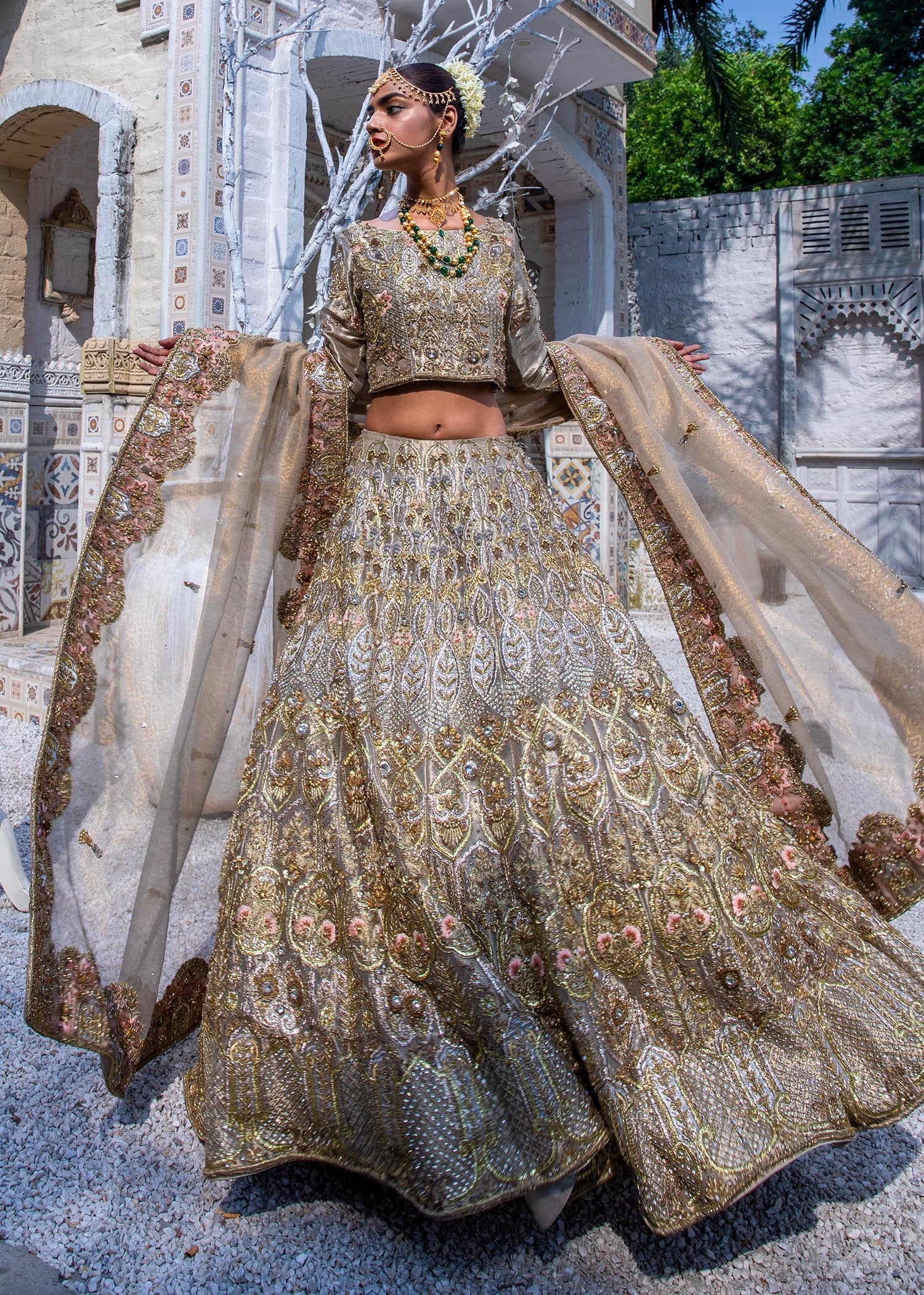 Description : An amazing lehnga outfit for the wedding day of your dreams! Gold Indian tissue fabric of lehnga choli heavily hand embroidered with kora, dabka, nakshi, tilla, gotta, Mukesh, resham. Paired with a self-embroidered Masoori net dupatta with heavy four-sided embroidered dupatta.