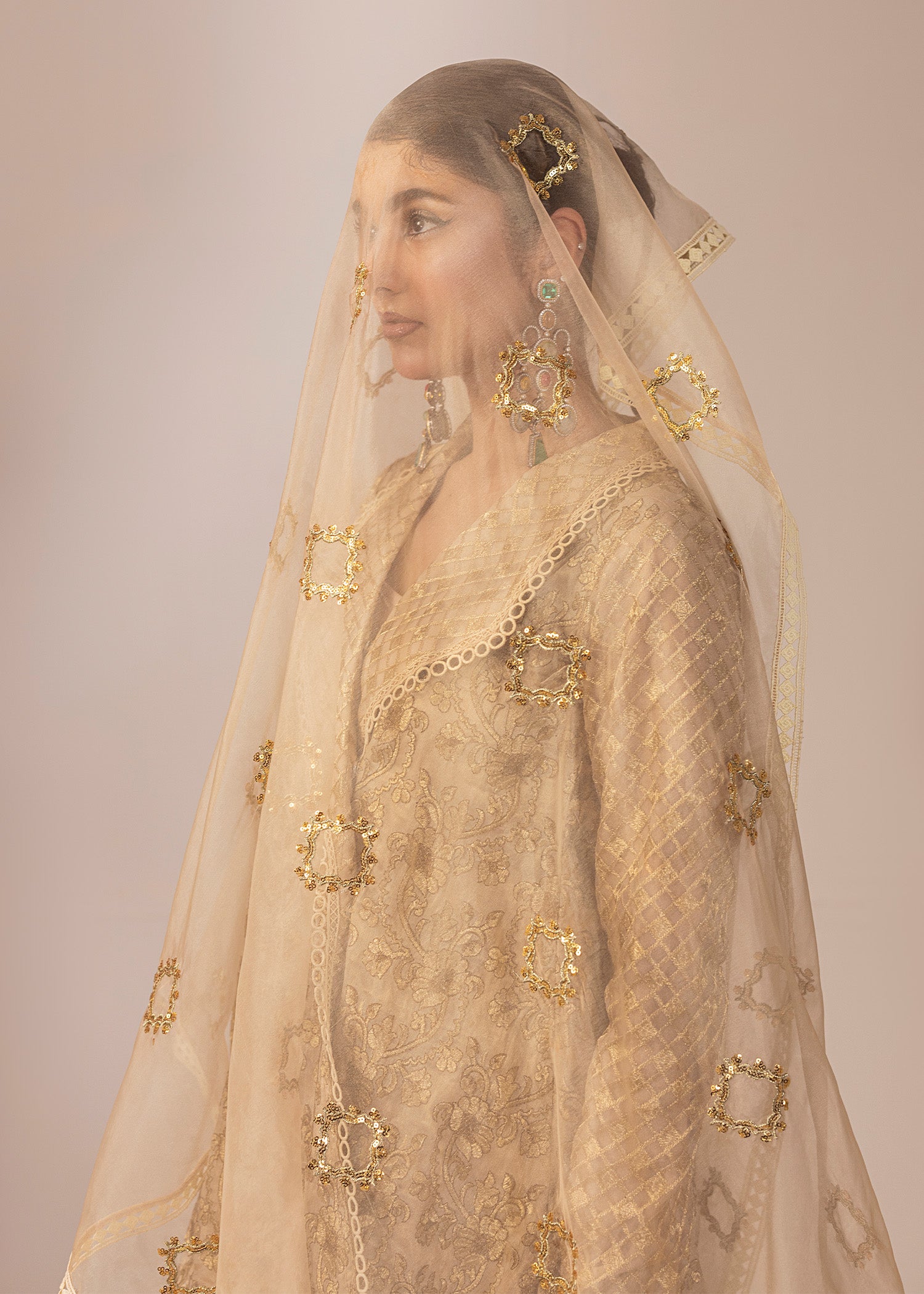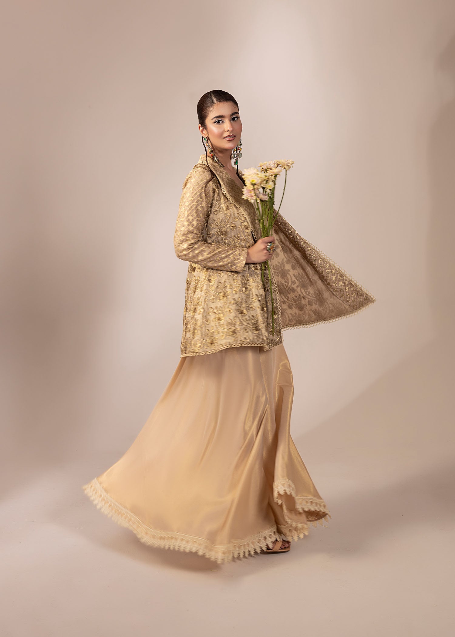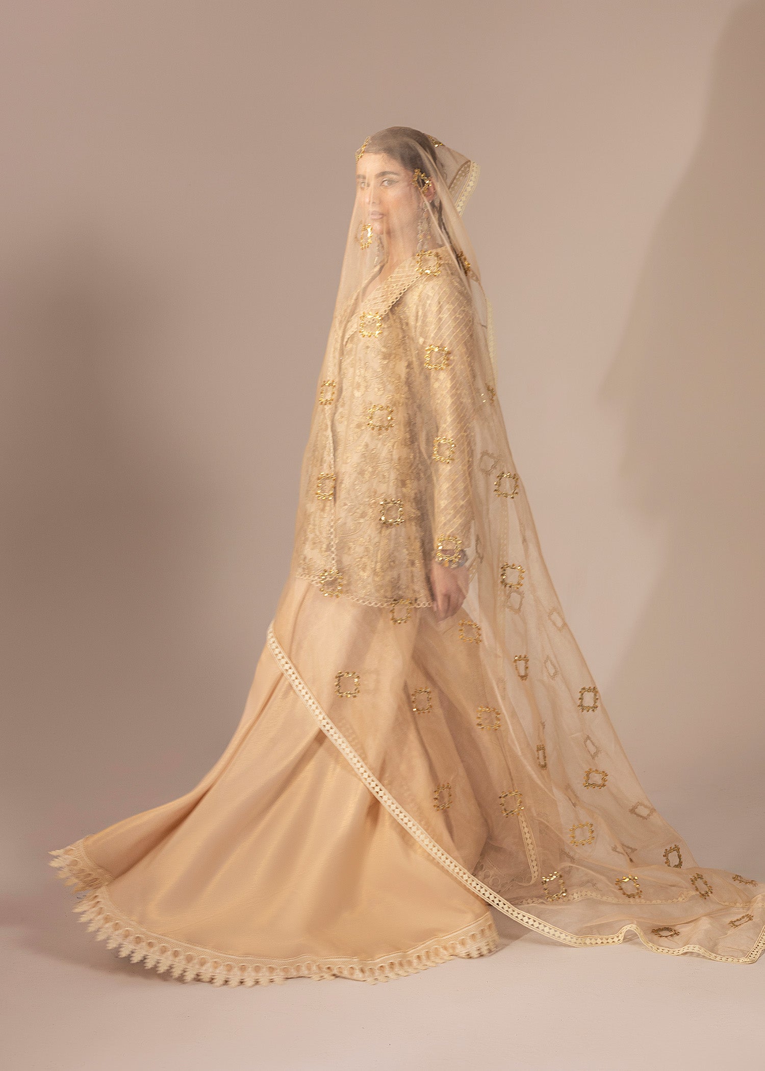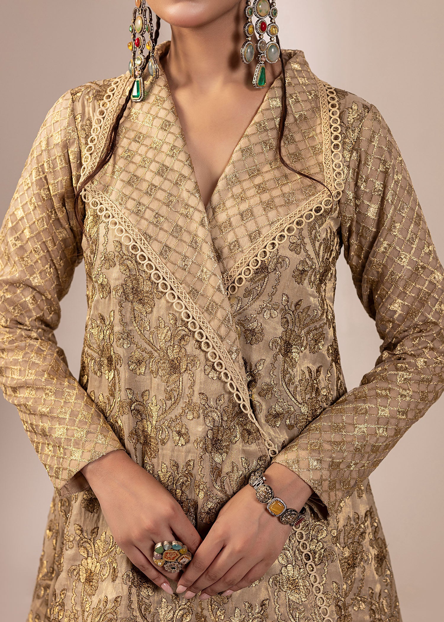 Product Description: Discover timeless grace in this alluring mustard-toned angrakha gown, meticulously crafted with a body-cut silhouette. The entire ensemble radiates sophistication through its elaborate tilla embroidery and brilliant sequin work, featuring a unique fusion of blooming floral designs and modern square motifs. It comes complete with a translucent matching dupatta, subtly embellished with its own shimmering details, offering an exquisite balance of heritage artistry and contemporary flair.