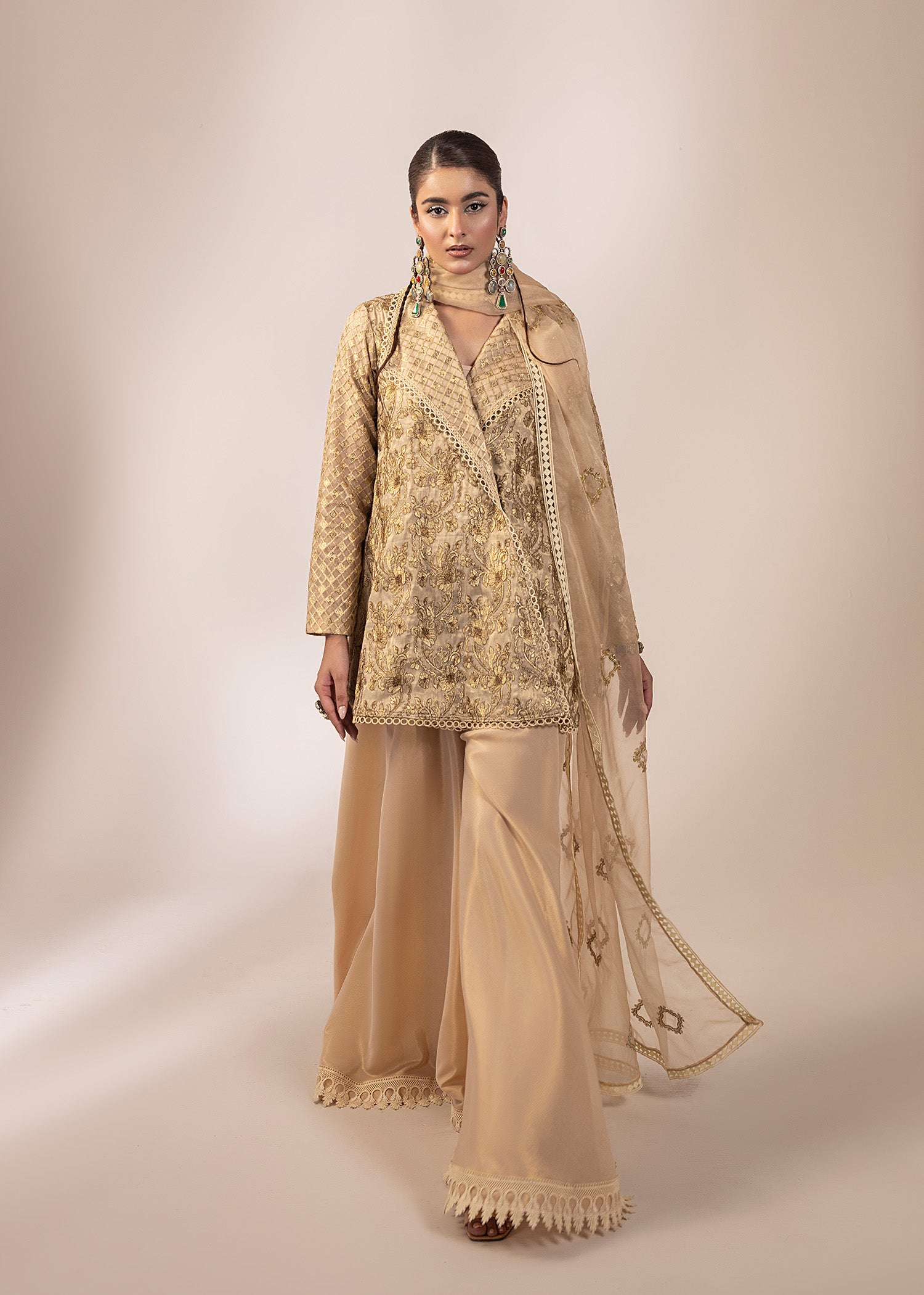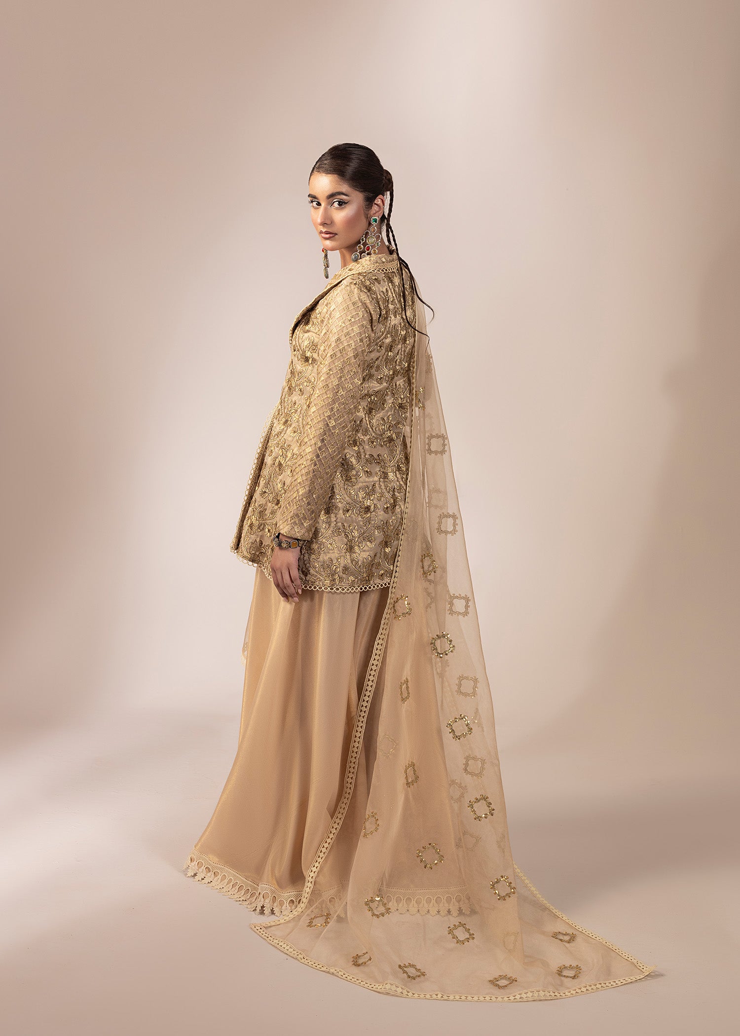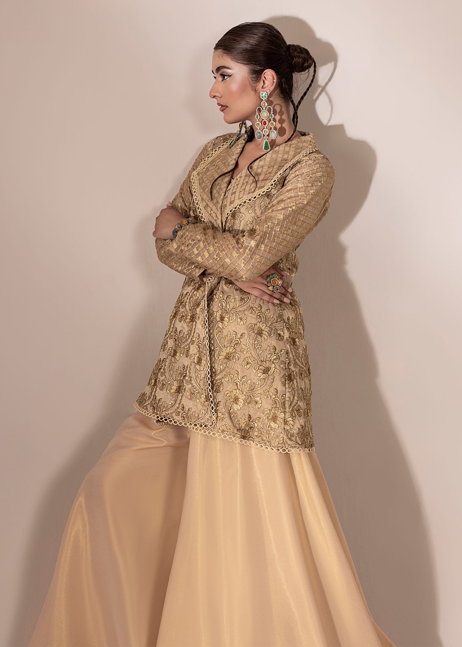 Product Description: Discover timeless grace in this alluring mustard-toned angrakha gown, meticulously crafted with a body-cut silhouette. The entire ensemble radiates sophistication through its elaborate tilla embroidery and brilliant sequin work, featuring a unique fusion of blooming floral designs and modern square motifs. It comes complete with a translucent matching dupatta, subtly embellished with its own shimmering details, offering an exquisite balance of heritage artistry and contemporary flair.