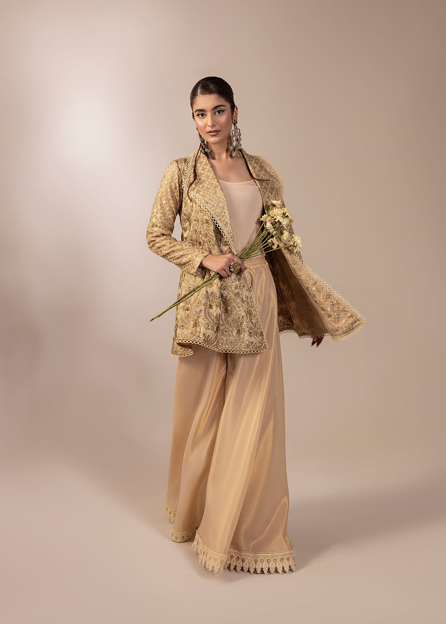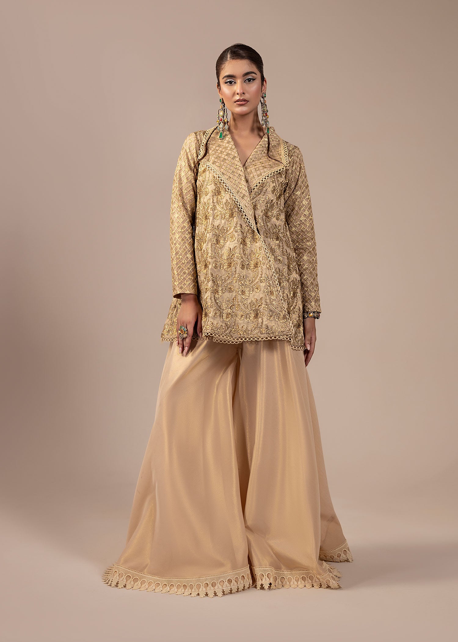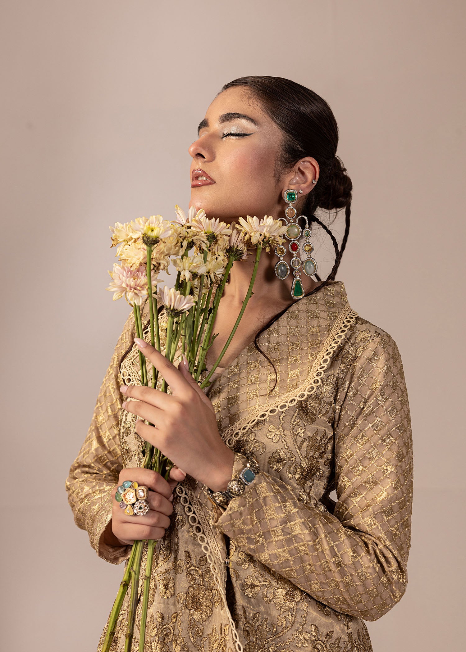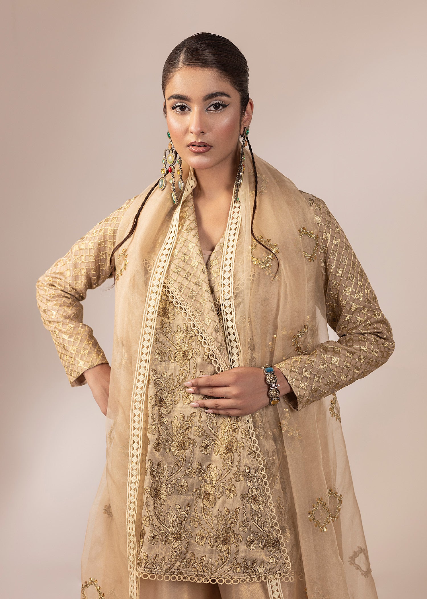 Product Description: Discover timeless grace in this alluring mustard-toned angrakha gown, meticulously crafted with a body-cut silhouette. The entire ensemble radiates sophistication through its elaborate tilla embroidery and brilliant sequin work, featuring a unique fusion of blooming floral designs and modern square motifs. It comes complete with a translucent matching dupatta, subtly embellished with its own shimmering details, offering an exquisite balance of heritage artistry and contemporary flair.